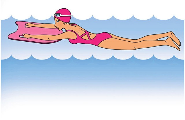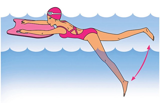 2. Активно двигай ногами: одна идет вверх, вторая вниз, потом наоборот. Старайся не сгибать ноги в коленях. Плавай так в течение 15 минут.