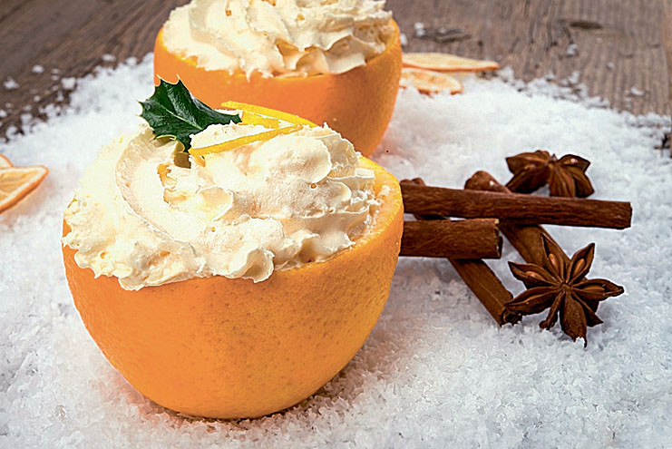 Добавь в 250 мл воды сахар, помешивая, доведи до кипения. Когда сахар растворится, положи специи, цедру и кипяти 5 мин. Остуди сироп, добавь ваниль. Апельсиновые дольки залей сиропом и, накрыв пленкой, поставь в холодильник на 1 ч. Смешай все ингредиенты для крема. Апельсины разложи по креманкам, укрась сверху кремовой «шапкой», анисом и корицей.