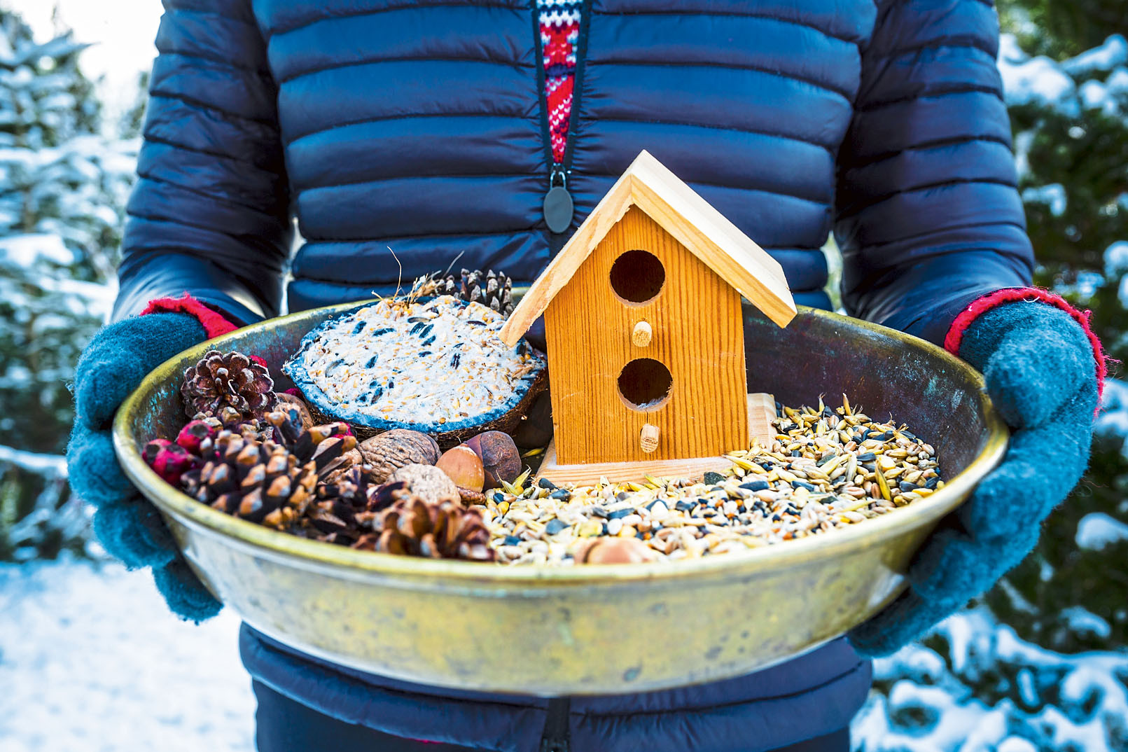 Готовый корм. Вариант для ленивых «натуралистов». В нем собраны семечки, орехи, сухофрукты, трава. Купить можно в любом зоомагазине или на маркетплейсе. Насекомоядных птиц (дятлы, сойки и т. п.) можно подкормить сухим кормом «Гаммарус». Конечно, он предназначен для рыбок, но высушенные рачки, в которых много микроэлементов, понравятся и пернатым.