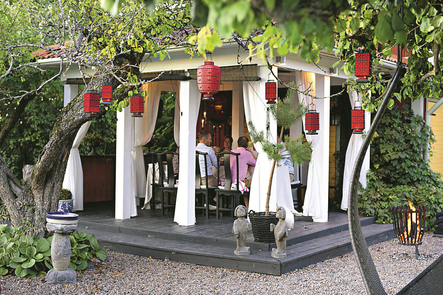 ОТКРЫТЫЙ УЧАСТОК. Это может быть уютный уголок сада с живописными окрестностями: ухоженным водоемом, стильным рокарием или эффектными клумбами. Оптимально, если летняя кухня располагается в глубине участка (но как можно дальше от туалета, компостных ям и мусорных баков) и при этом надежно защищена от ветра, солнечного зноя и любопытных соседских взглядов. Для открытой летней кухни важно выбирать тенистое место, например, под раскидистым деревом, которое должно быть достаточно высоким, чтобы его крона не нависала над плитой, печью или мангалом.