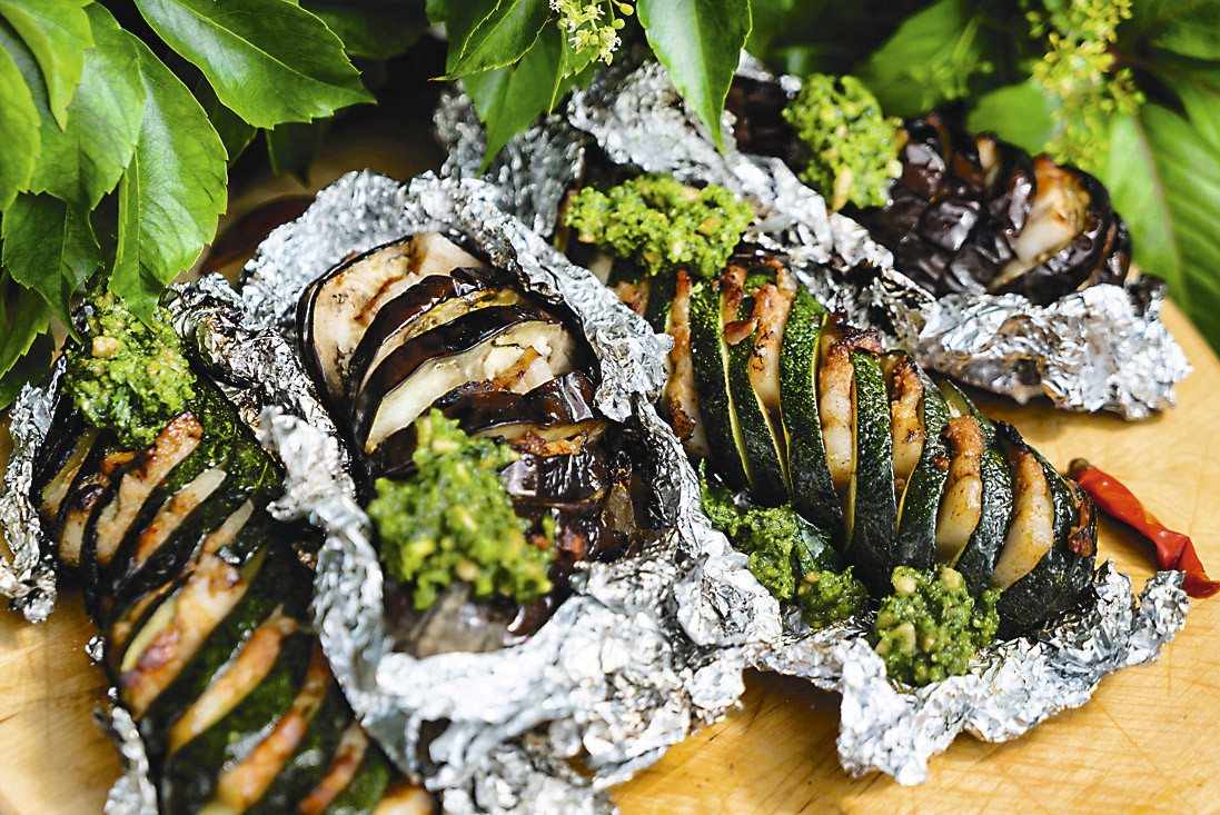 Приготовление. Сделай на баклажанах по 5–6 надрезов, не доходя до середины. Наруби зелень с чесноком, перемешай с оливковым маслом и специями. Нарежь сало слайсами, вставь в разрезы. Обмажь овощи маринадом, заверни в фольгу, запекай на углях до готовности.