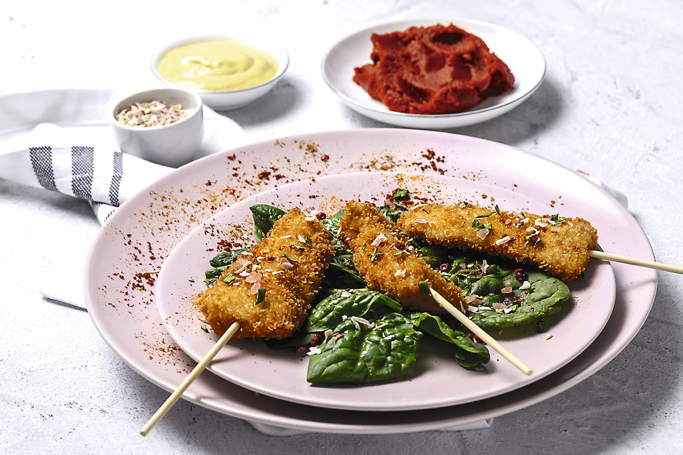 Приготовление. Нарежь овощи кусочками, залей оливковым маслом. Поджарь на решетке до полуготовности. Смешай тертый сыр со специями и солью. Обваляй кабачки в панировке, доведи до готовности на шпажках. Готовое блюдо посыпь зеленью и остатками сыра.