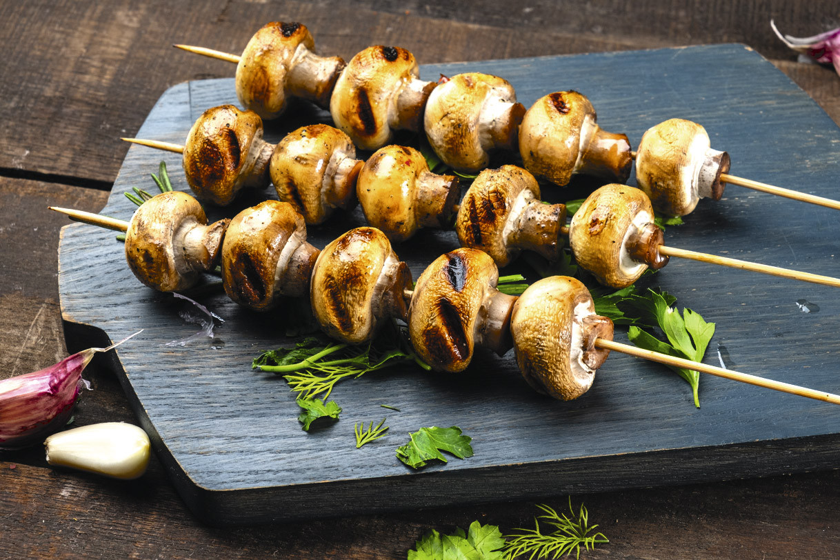 Приготовление. Замаринуй шампиньоны перед поездкой: помой, просуши, полей лимонным соком, добавь соль, черный перец и ложку масла. Отправь грибы в холодильник на 5–6 часов.На пикнике насади шампиньоны на шпажки, пожарь на мангале. Грибы сморщатся, но внутри останутся очень сочными.