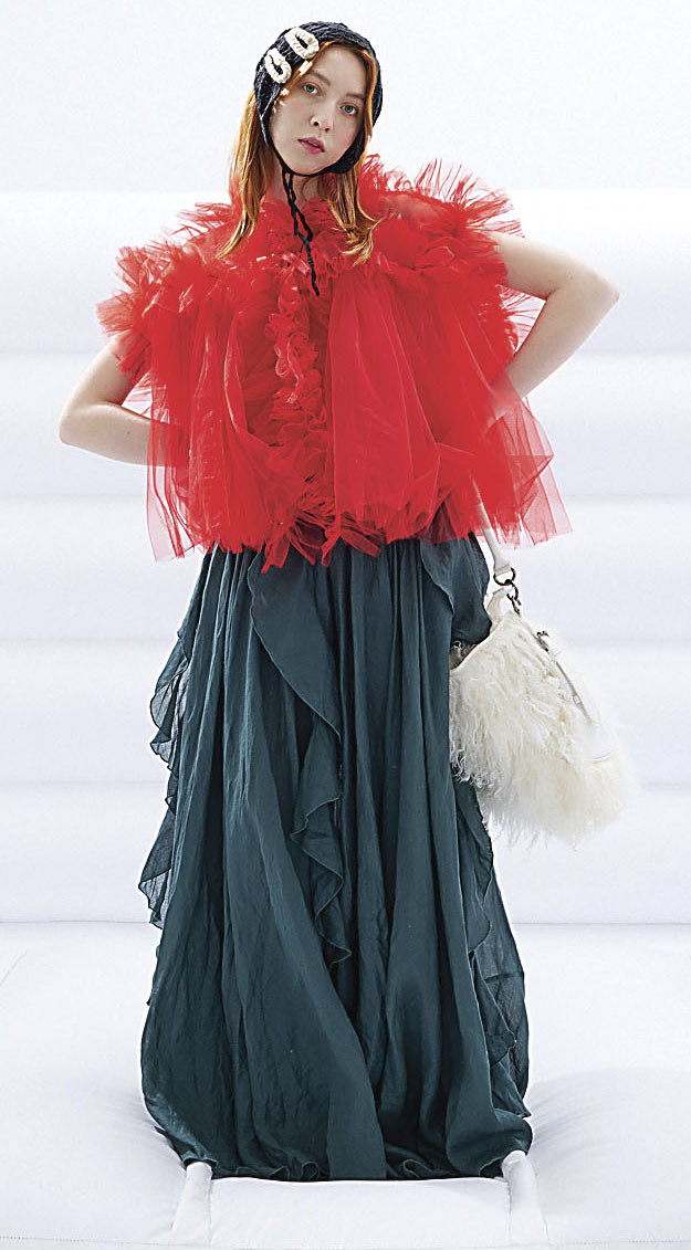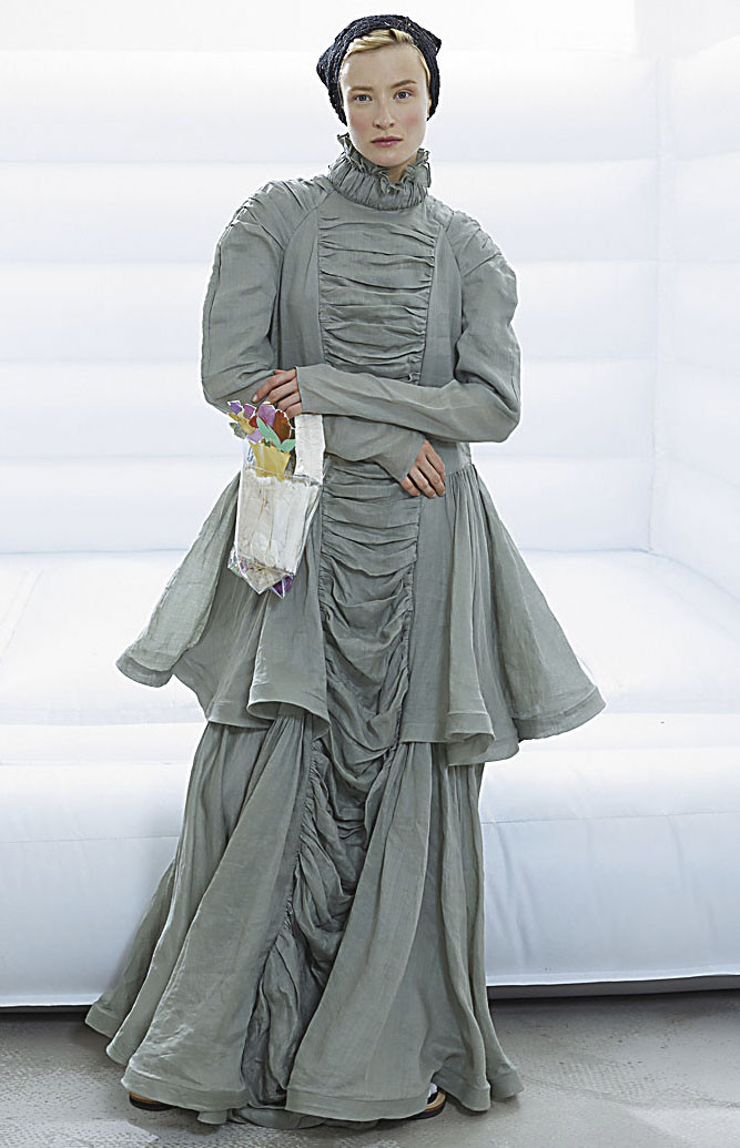 Мне близка работа с натуральными тканями. Одна из любимых – вареный хлопок. Это очень кропотливая ручная работа: хлопок многократно вываривают, деконструируют, обрабатывают, и в результате ткань приобретает особую фактуру, как будто из бабушкиного сундука. Он словно хранит в себе тепло старины, но при этом остается невероятно живописным – отлично сочетается с кружевом, рваными швами, дырочками и заплатками. Кроме того, люблю работать с фатином, шерстью, эвкалиптовой вуалью, крапивой, пайетками, блестящими поверхностями. Использую переработанные ткани и миксую их с инновационными. Для меня важно, чтобы ткань помогала выразить идею, и тогда в ход может пойти всё – от тончайших кружев до пластиковых элементов.