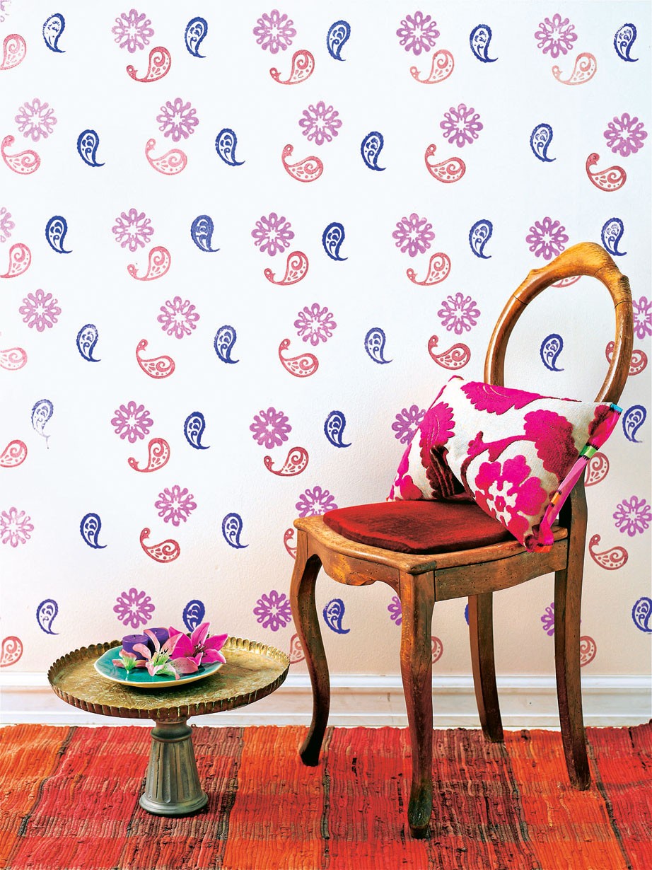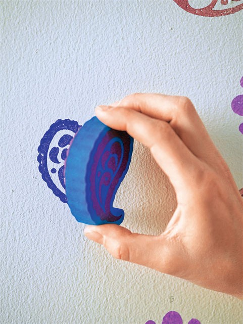 2. Обмокни губку в краску, нанеси на штамп и плотно приложи его на указанную точку. Продолжай до тех пор, пока не получишь на стене нужный орнамент.