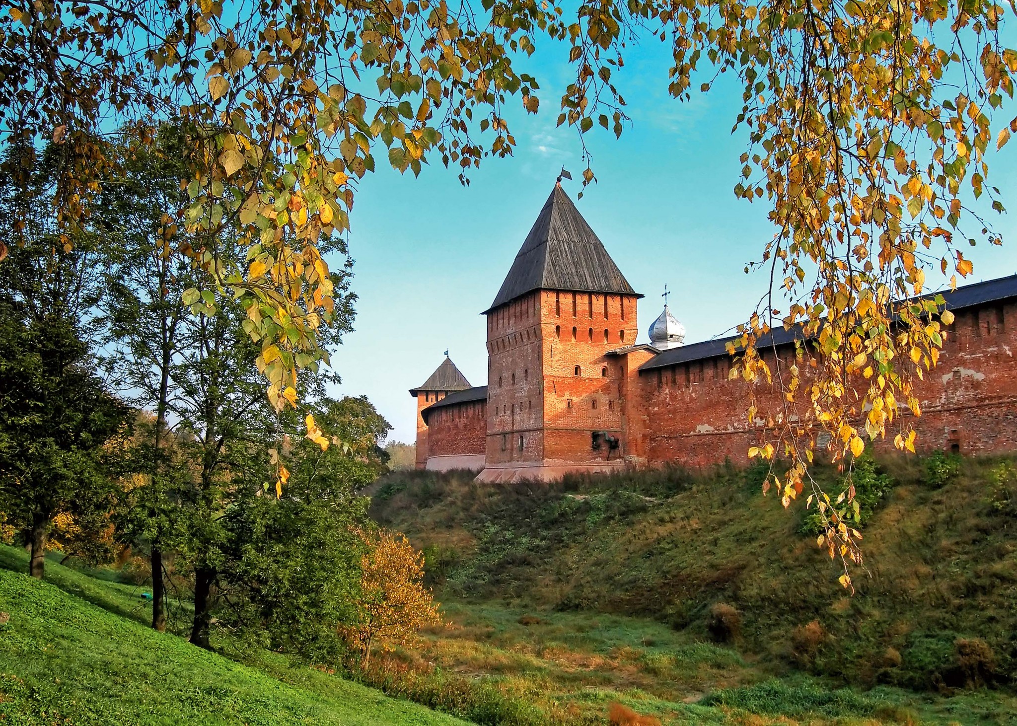 Если погода позволяет, обязательно поднимись на стену Кремля, откуда открывается восхитительный вид на город и реку Волхов.
