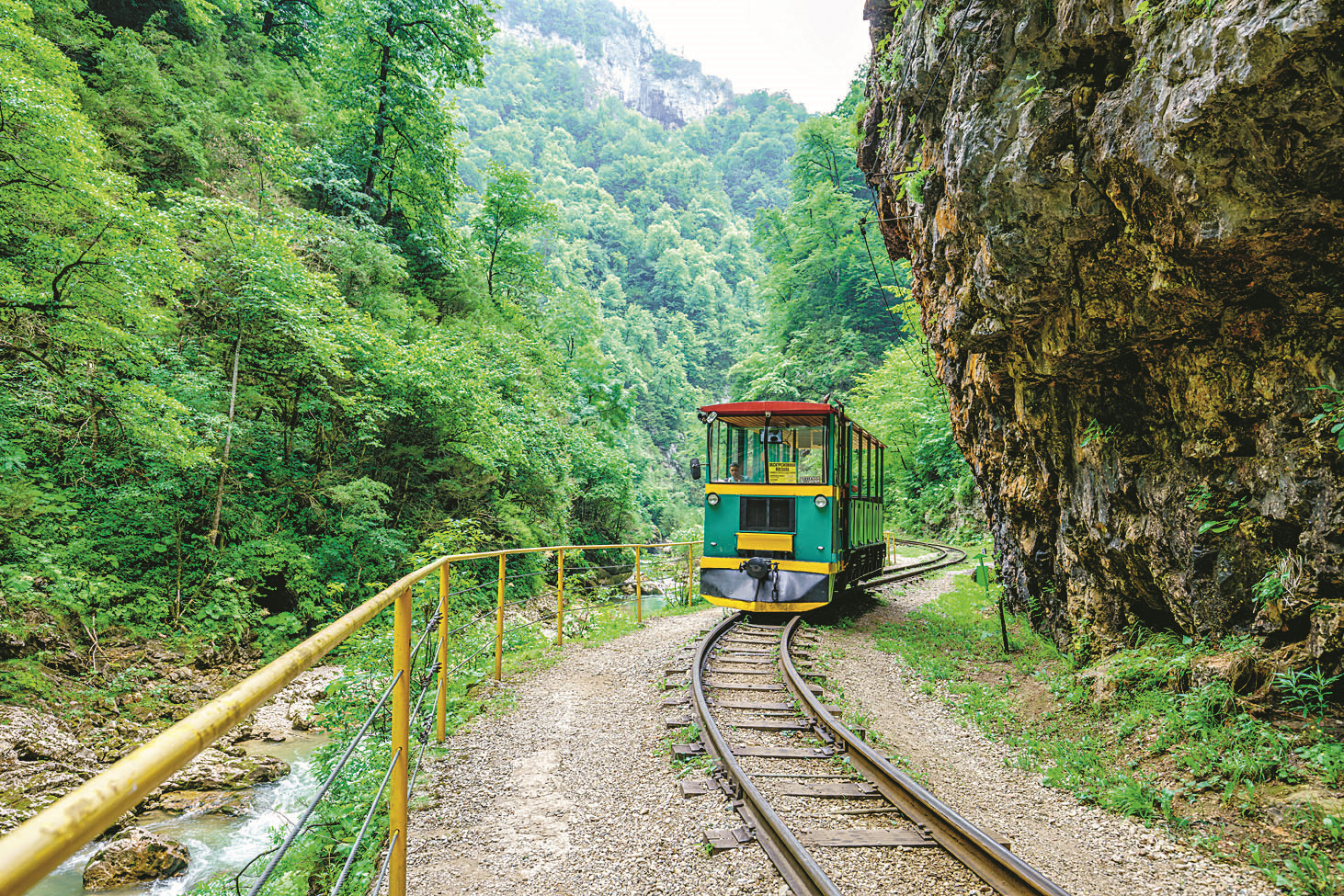 НО НАСТОЯЩИМ ПРИРОДНЫМ ЧУДОМ КРАСНОДАРСКОГО КРАЯ МОЖНО БЫЛО БЫ НАЗВАТЬ ГУАМСКОЕ УЩЕЛЬЕ. Находится оно в Апшеронском районе и проходит вдоль русла реки Курджипс, зигзагами проложившей себе путь между высокими хребтами. По одной из версий, река эта древняя и вытекала из такого же древнего озера, пробив проходы среди гор. Ущелье тянется на 5 км, а в глубину достигает 400 м! Местами расстояние между противоположными скальными стенами сужается до 2 м. И представь себе, что в этой теснине в 1930-е годы была построена узкоколейка! Цель была чисто утилитарная – перевозка грузов. Но уж больно проблемный путь оказался – камнепады, оползни… И дорогу постепенно забросили. Сейчас на некоторых участках ее удалось успешно восстановить, а на одном из них весело бегает туристический поезд.