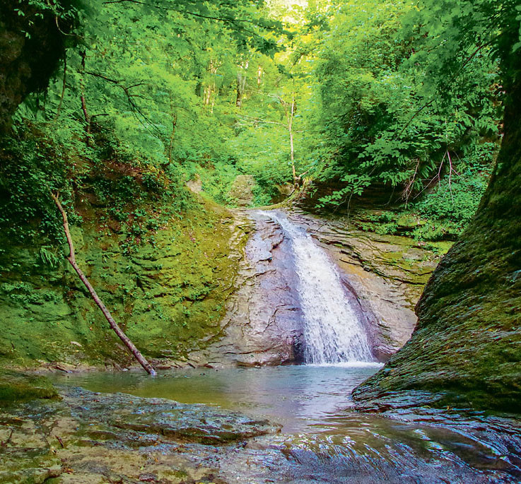 Ущелье Мишоко славится не только своими крутыми скалами, но и не менее крутыми водопадами. Их на территории – десять штук. Самым красивым считается – Наковальня. Особенность этого водопада в том, что под ним нет чаши – природного углубления, где скапливается вода. Наковальня бьет прямо в скалу.