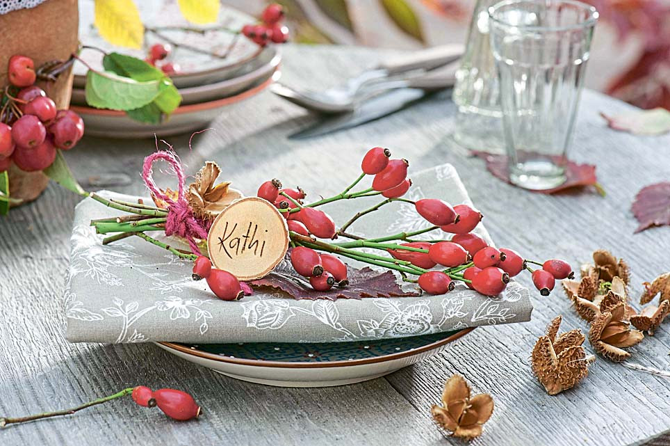 Лучше всего для этого подойдут багряные листья японского клена и красные ягоды – рябины, калины, боярышника, барбариса. Ими можно украсить приборы, бокалы или просто поставить в вазу на столе живописным букетом.