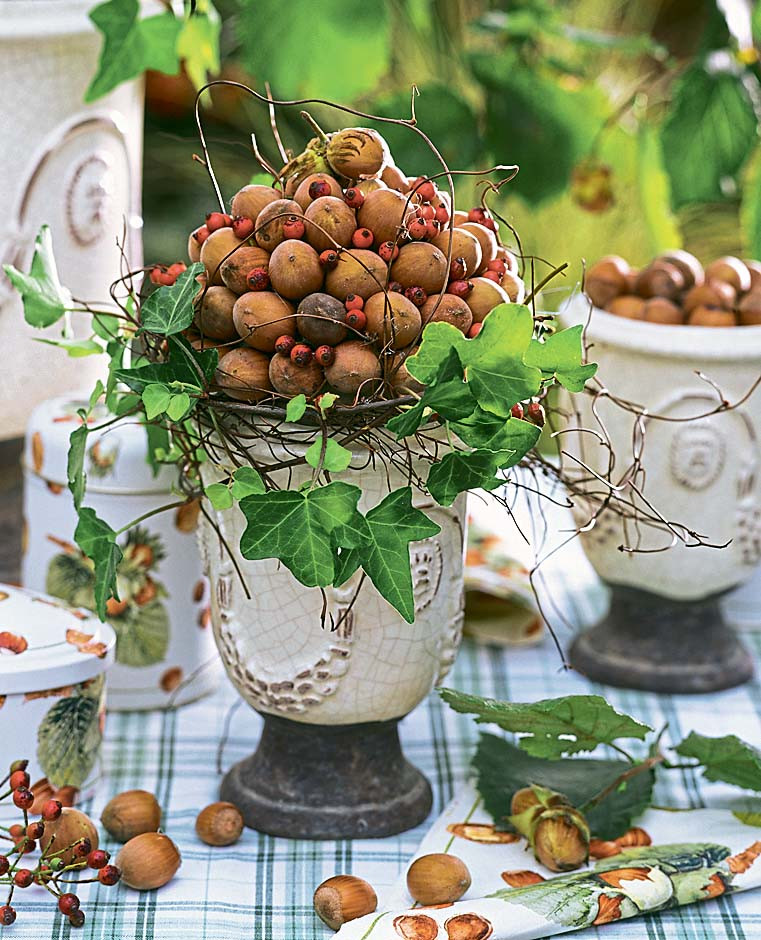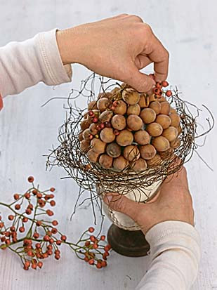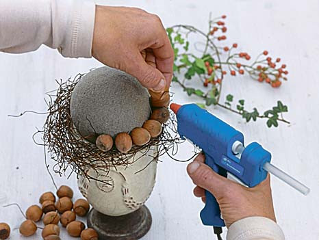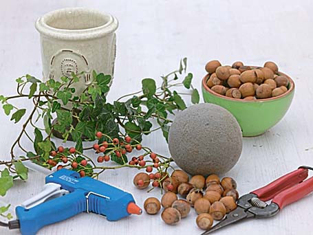 Понадобятся: • плоды лещины (лесного фундука) • ягоды • ветки с листьями • горшок • теннисный мяч • клеевой пистолет