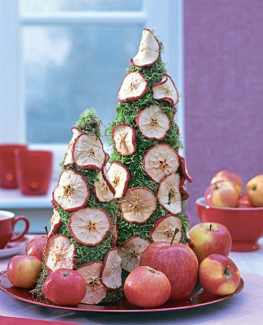 На картонный конус наклеивается искусственный мох. Дольки сушеных яблок нужно также наклеить сверху или приколоть булавками. Можно добавить ягоды калины.