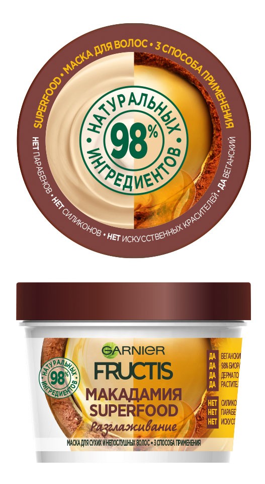В период холодов волосы могут становиться более сухими и непослушными даже у тех, кто обычно не испытывает трудностей с укладкой. Моментально смягчить их и сделать гладкими поможет маска SUPERFOOD с маслом ореха макадамия. Масло богато жирными кислотами, которые преобразят волосы изнутри и снаружи, сделают напитанными и блестящими. В формуле маски отсутствуют силиконы, парабены и искусственные красители, которые могут вызывать раздражение кожи головы и утяжелять волосы. На обратной стороне упаковки подробно перечислен ее состав, и ты можешь лично убедиться, что в средствах SUPERFOOD не скрывается ничего лишнего. Если наносить маску как смываемое средство, волосы будут в 3 раза более послушными, чем раньше. А если использовать ее как несмываемый уход, то ты усмиришь непослушную шевелюру и в 4 раза быстрее сделаешь стильную укладку.
