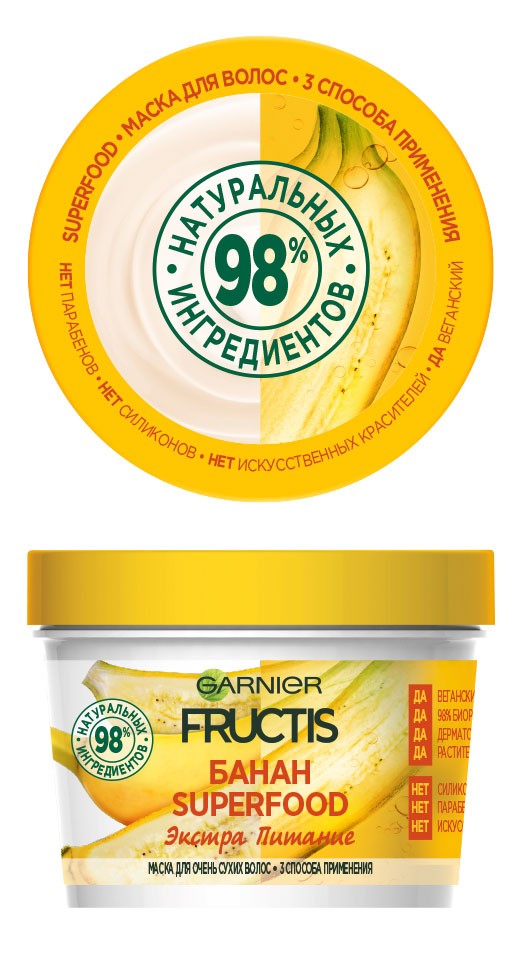 Сухим волосам, чтобы стать мягкими и блестящими, нужно глубокое питание. Получить его можно из растительных масел, которые хорошо проникают внутрь волоса и также защищают его на поверхности. В маске SUPERFOOD с экстрактом банана, как и во всей линейке, содержится сразу три натуральных масла: кокосовое, соевое и подсолнечное. Они придают волосам мягкость и шелковистость, а банан за счет высокого содержания калия поддерживает необходимый уровень увлажнения. Можешь наносить SUPERFOOD несколькими способами: как маску, бальзам и несмываемый уход.