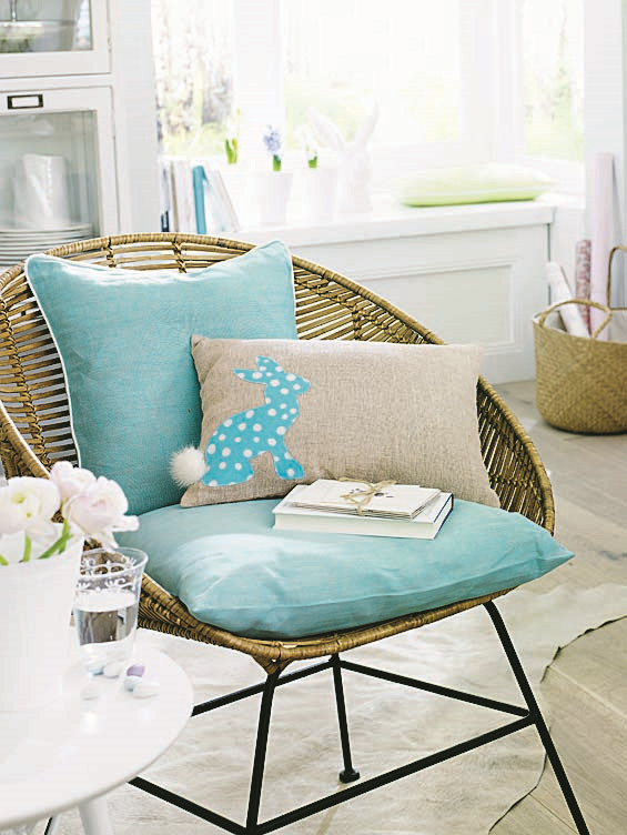 Пасхальное настроение в доме можно создать с помощью тематических деталей из текстиля. Например, декоративных подушек с изображением символа праздника – кролика, или с цветочным принтом.