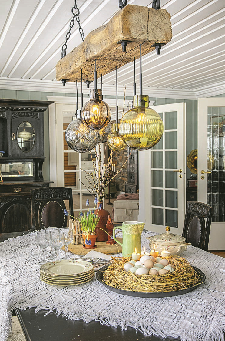Легкие и изящные стеклянные украшения выглядят очень стильно и не утяжеляют пространство. Можно украсить сухие ветки стеклянными яйцами. Или подвесить цветы в прозрачных вазах.