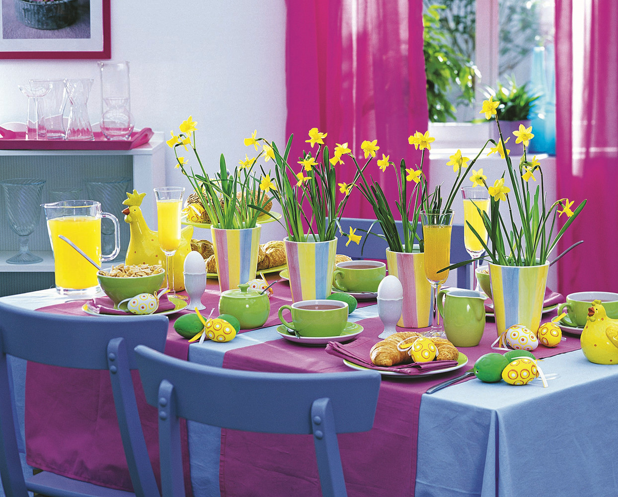 На столе должны быть символы праздника – пасхальные яйца, фигурки кур, кроликов.