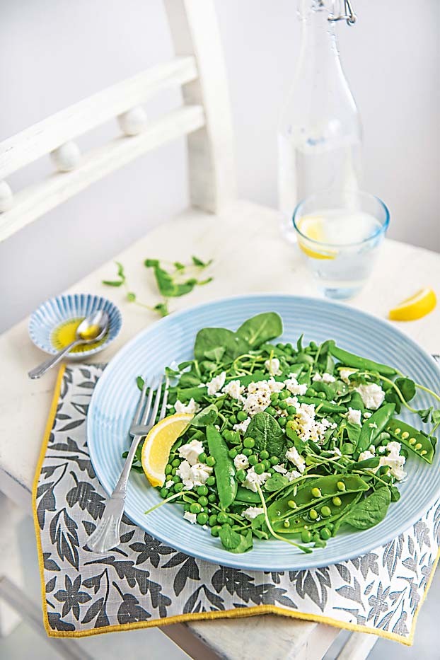 ПРИГОТОВЛЕНИЕ: отвари горошек до готовности. Слей и остуди. Положи шпинат в миску, добавь горошек, измельченные листья мяты, фету и все перемешай. Сбрызни лимонным соком и растительным маслом. Добавь морскую соль и молотый перец.