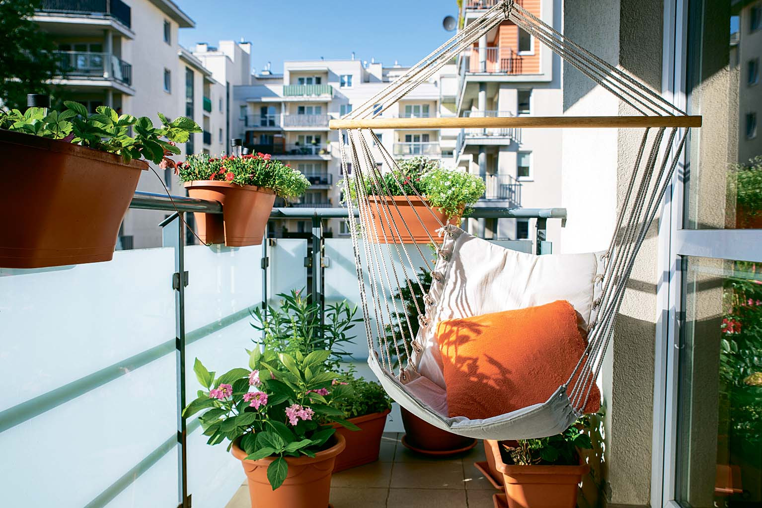 Укрась балкон с помощью однолетних растений. Развесь кадки с петуниями ярких цветов, бальзаминами, лобелиями, анютиными глазками, хризантемами. Все они не требуют особого ухода, а цветут все лето.
