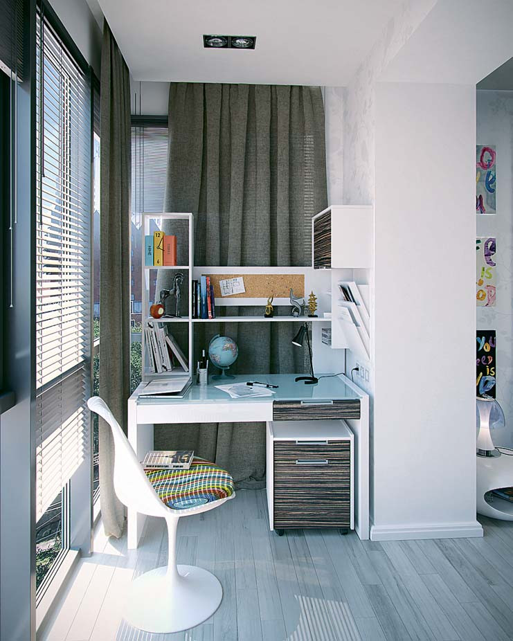 Полки. Если предстоит работать с бумагами и книгами, есть шанс «завалить» и без того маленький новоявленный рабочий кабинет. Поэтому продумай пару полок или подбери несколько красивых коробок (можно разместить под столом).