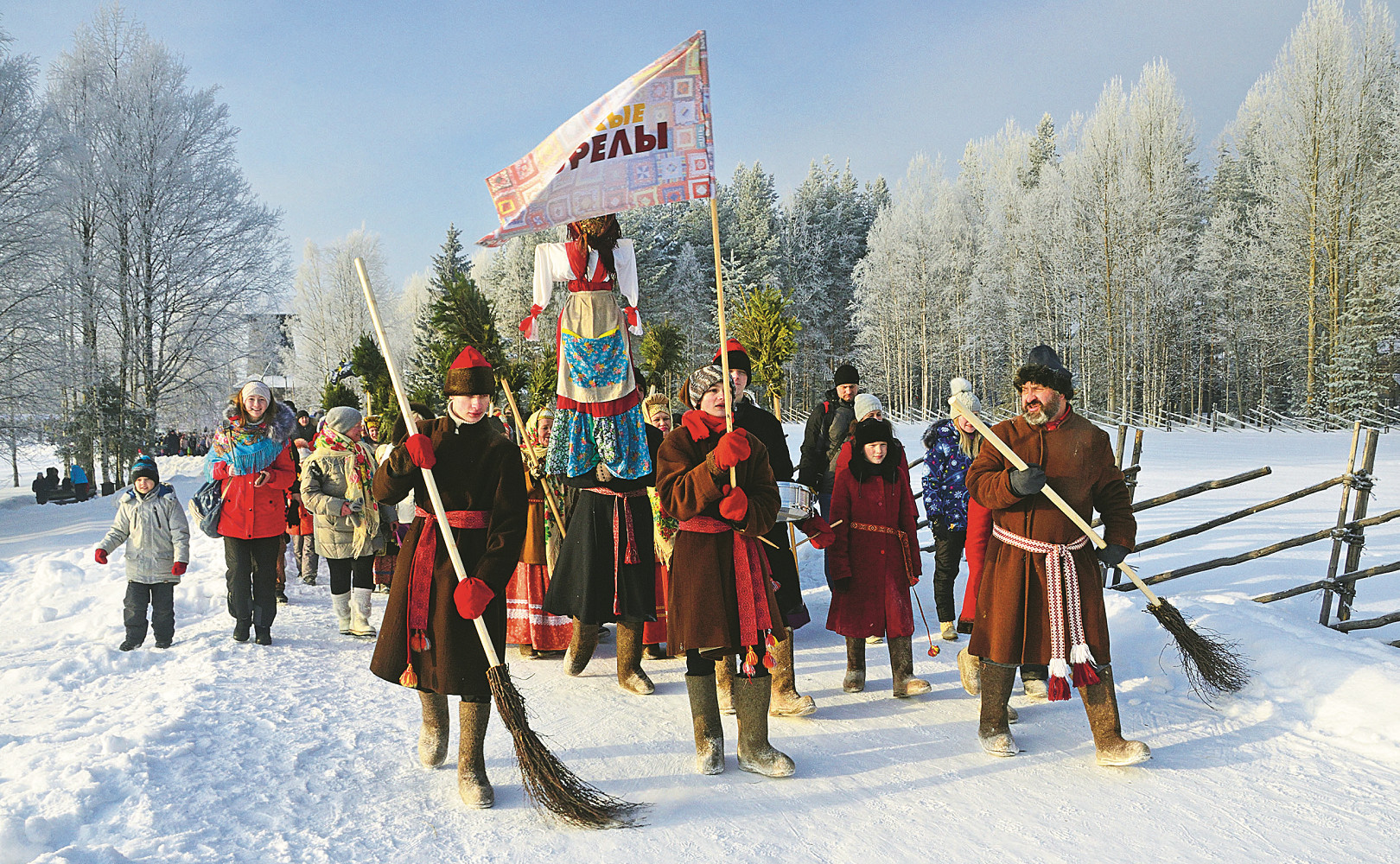 ОБЫЧНО НАРОДНЫЕ ГУЛЯНИЯ В АРХАНГЕЛЬСКЕ проходят на набережной Северной Двины. Веселье начинается с масленичного поезда с ряжеными. Спешившись с него, скоморохи зазывают на развлечения.