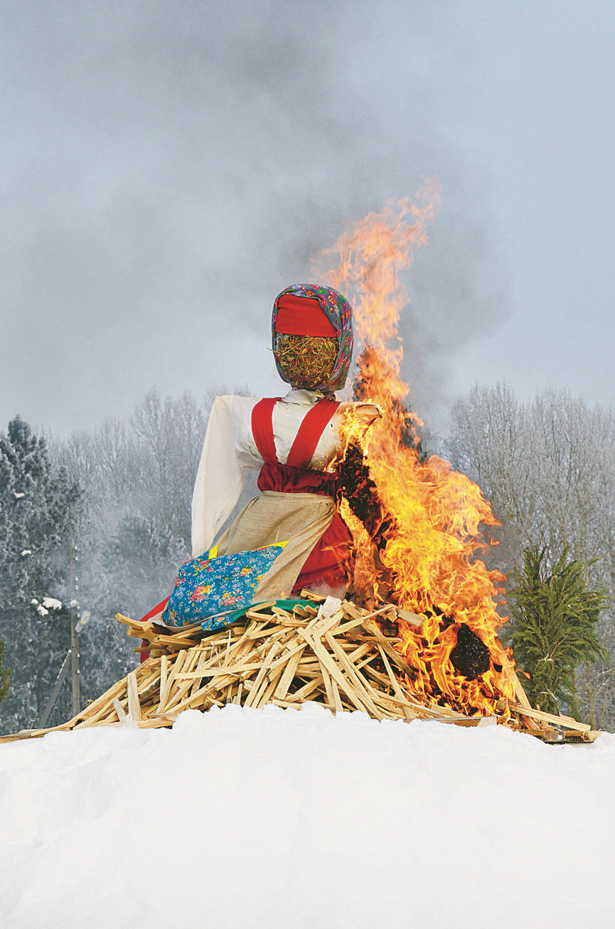 В последний день Масленицы все внимание обращено на куклу из соломы, которую наряжают в сарафан, рубаху, платок, фартук, усаживают в большие сани.