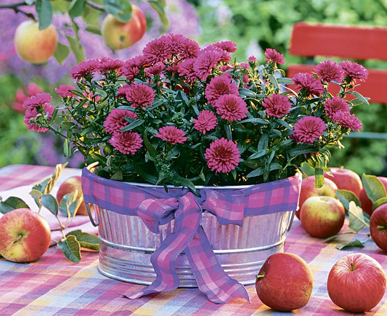 1. Астра. Бывает как однолетней, так и многолетней. Цветет с середины августа до первого снега. Существует более 200 сортов астр, отличающихся размером, цветом, формой соцветий. Многие сорта стойко переносят засушливое, солнечное лето. В благоприятных условиях, как и хризантема, астры могут заселить всю клумбу, поэтому важно проводить прополку.