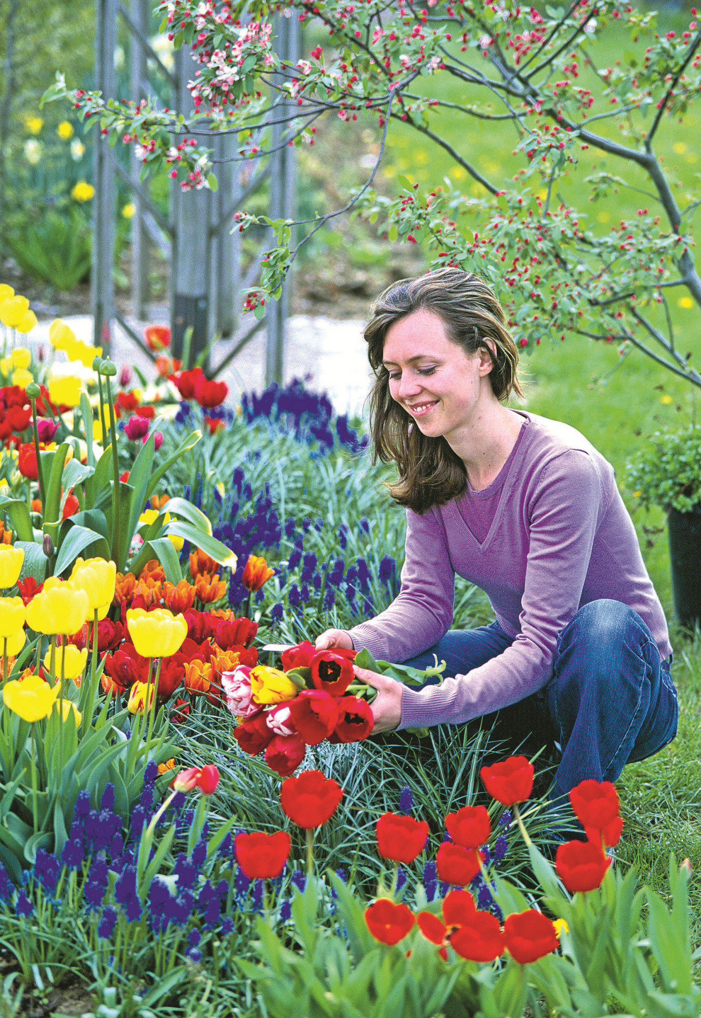 Дикорастущие виды крокусов и тюльпанов можно посадить не вместе, а вразброс. Просто подкинь над лужайкой горсть луковиц: где упали – там и сажай. Отверстия в таком случае удобно делать специальным металлическим конусом.
