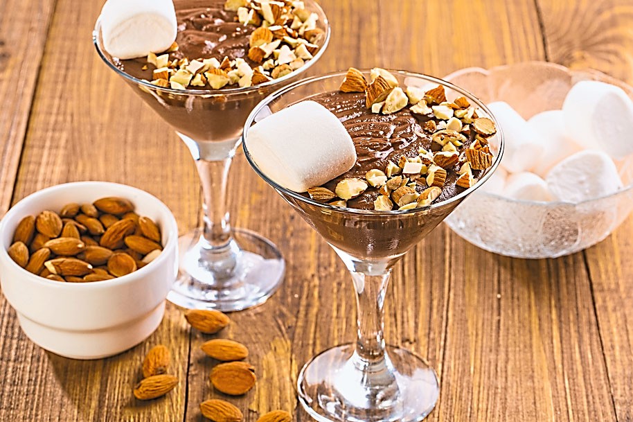 Приготовление: Муку развести 2 ст. л. холодного молока. Остальное молоко подогреть до 60°. Желтки взбить с сахаром, подмешать тертый шоколад. Добавить муку в молоке и перемешать. Затем постепенно влить теплое молоко. Поставить на огонь и, помешивая, довести до кипения. Варить до загустения. Дать остыть, разложить по креманкам, посыпать орехами, добавить маршмеллоу.