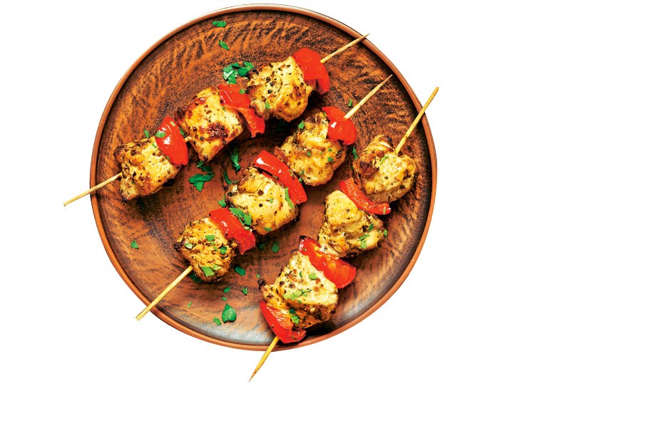 Приготовление: нарезанную на небольшие кусочки индейку замаринуй в смеси соуса, сметаны и горчицы. Добавь соль и перец. Деревянные шпажки замочи в воде, чтобы в духовке они не начали гореть. Затем нужно нанизать на шпажки мясо и ломтики помидоров. Запекай в дуковке 30 мин.