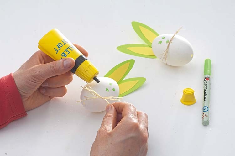 4. Вставь палочку (подойдут для суши). Осторожно закрепи их в отверстии скорлупы и перевяжи лентой.