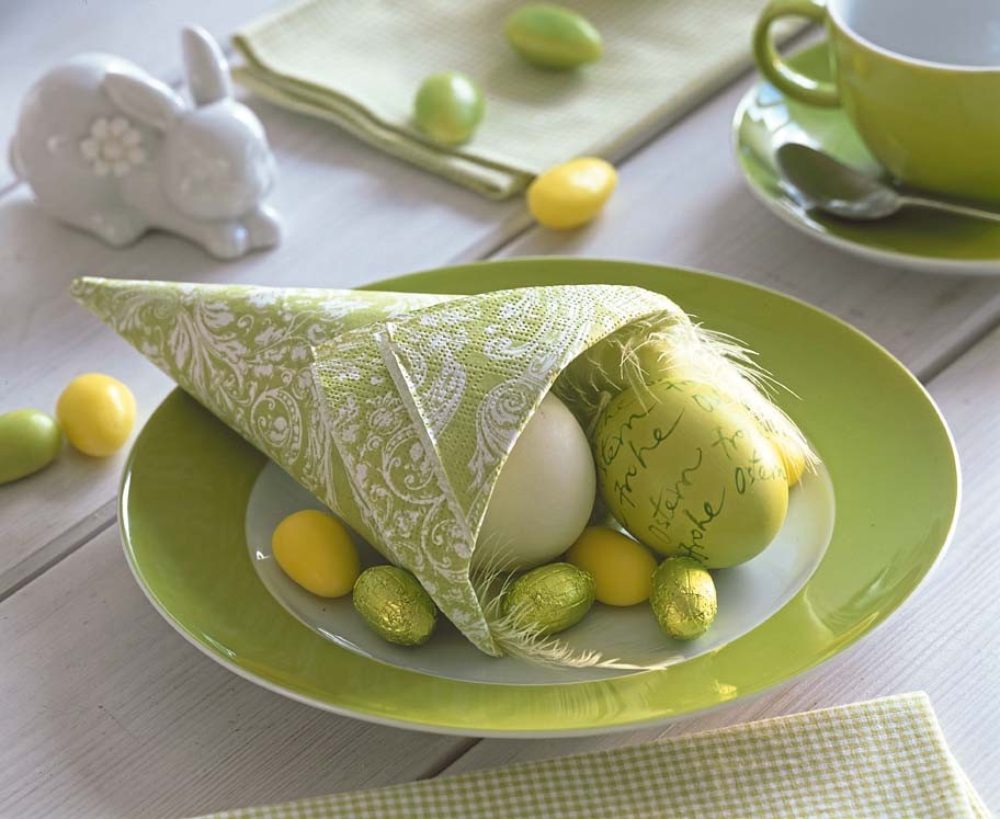 Сервируя стол, создай на каждой тарелке мини композиции из конвертов (основа – салфетка), наполненных обычными и шоколадными яйцами в блестящих обертках.