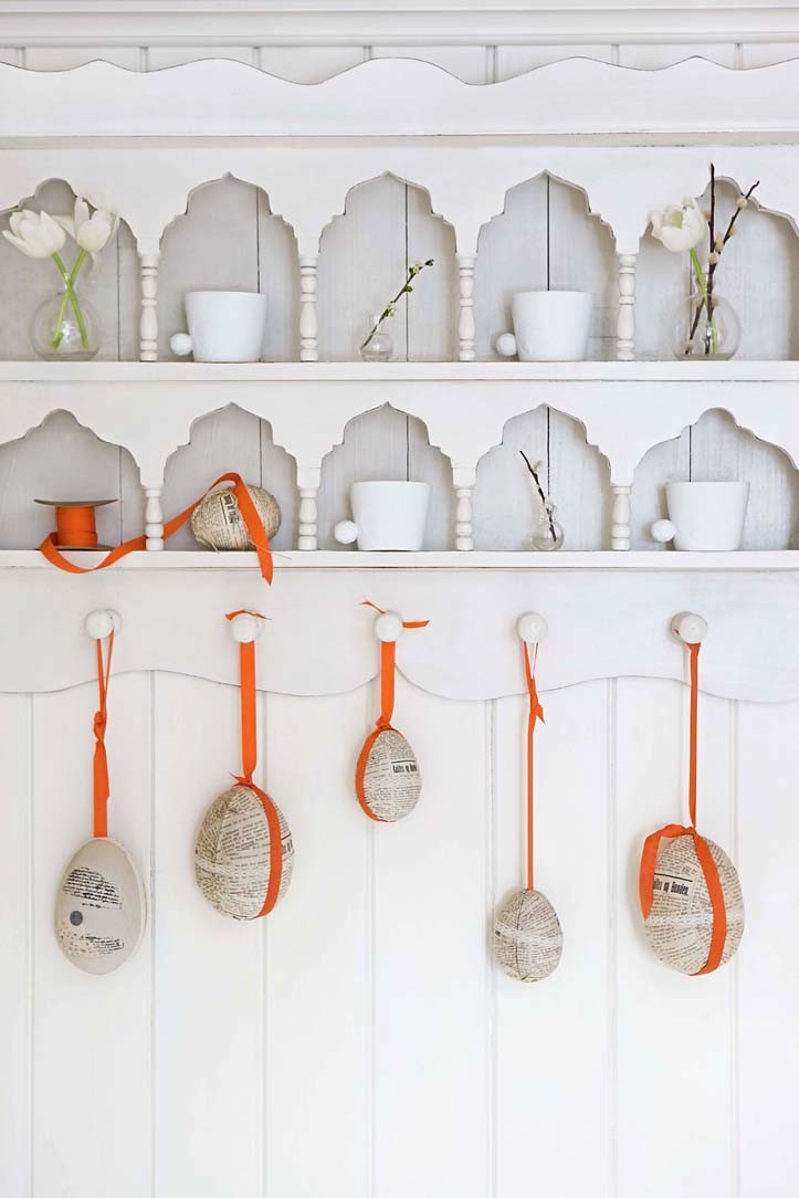 Не готова к кропотливой работе, о которой мы пишем выше? Купи стильные пластиковые яйца и также подвесь их при помощи тонких лент.