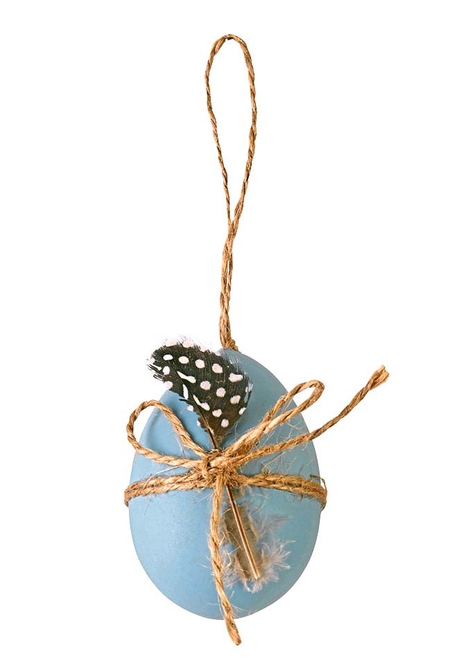 Смастери стильные подвески. Для этого сделай небольшой прокол в яйце и опустоши его при помощи шприца без иглы. Высуши скорлупу, покрась. Прикрепи бечевку и мелкий декор. Например, перья.