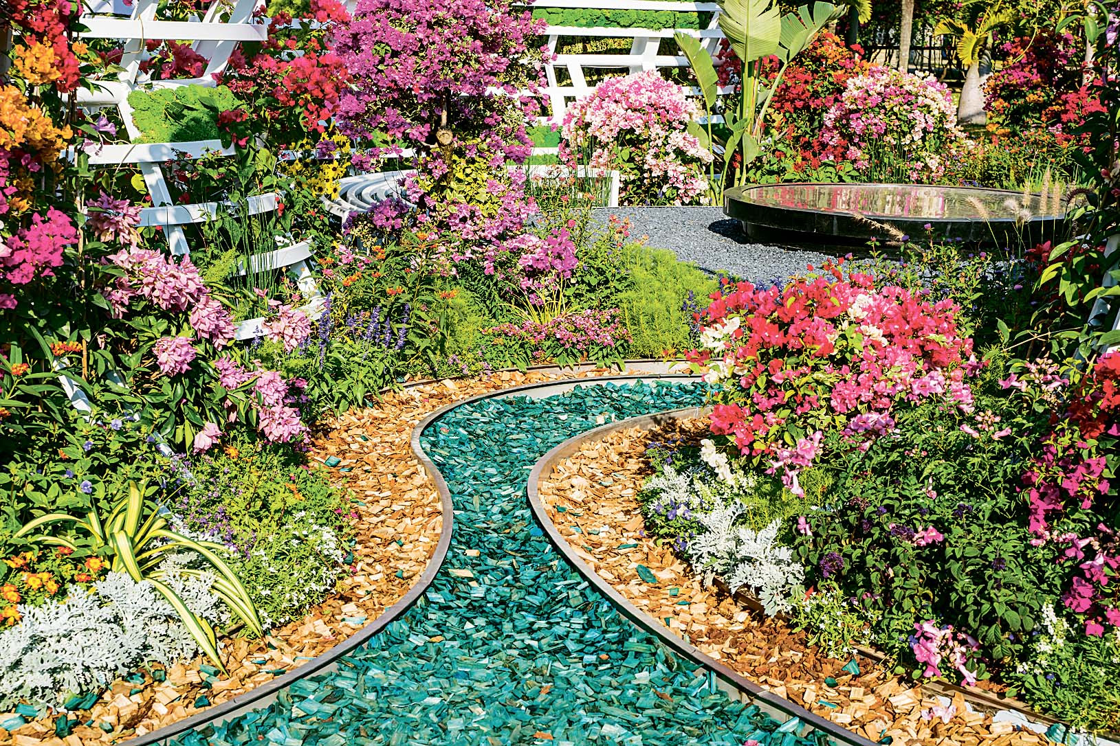 Ими удобно оформлять тропинки, сквозь щепки не прорастают сорняки, трава. Только периодически их придется подсыпать из-за проседания. Чтобы щепки не разлетались, лучше заранее установить бордюр из камня или кирпича.