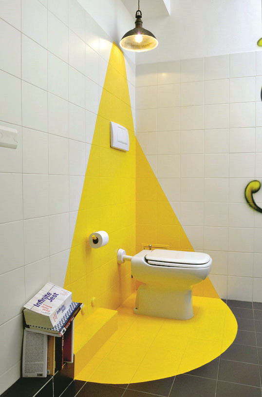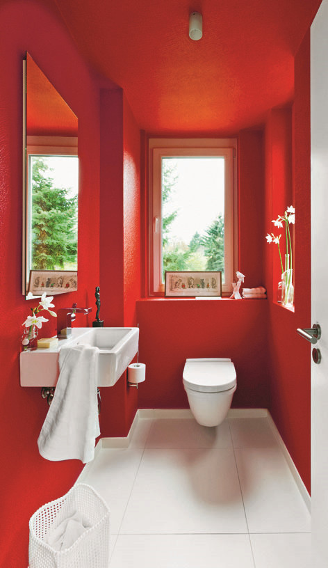 Известно, что этот цвет повышает тонус и заряжает бодростью. Пожалуй, для спальни или гостиной он слишком активный, а вот туалет получается классный.