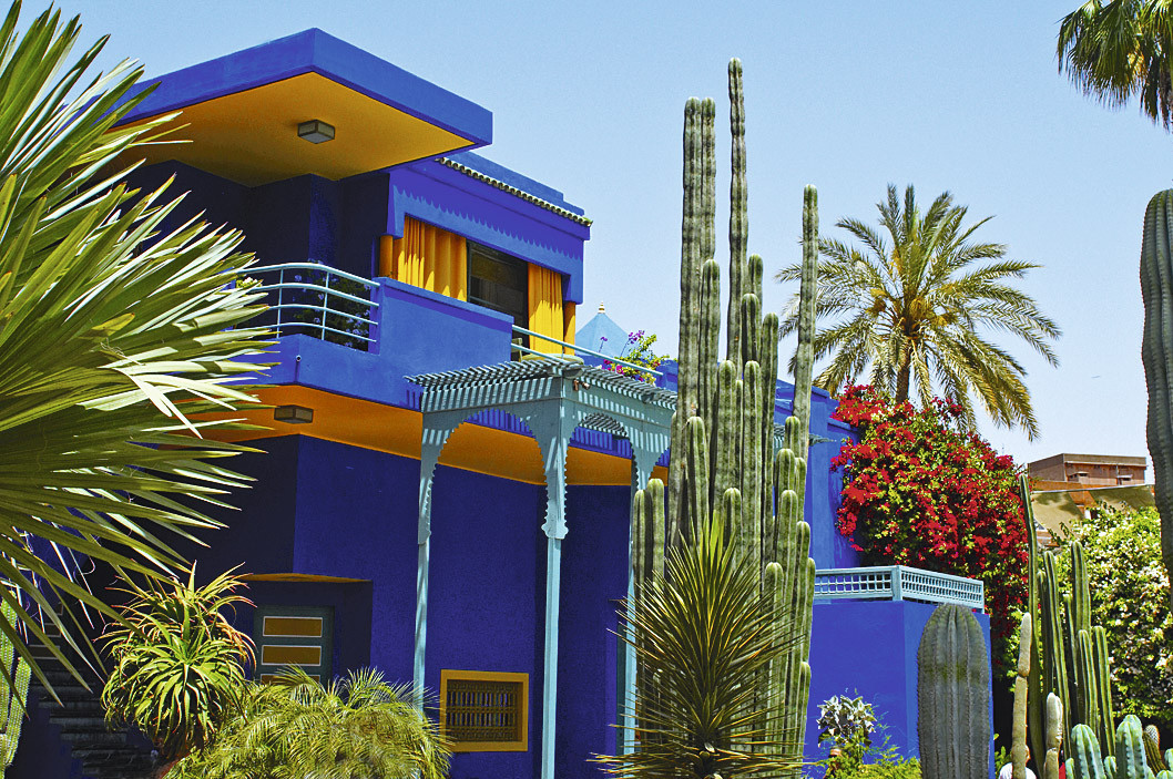 Когда в преддверии сумерек лучи солнца касаются минарета мечети Кутубия, буйство красок Марракеша сложно описать словами. 77-метровый символ древнего города сияет золотом. Цвет небес переходит от темно-синего к яркорозовому, сгущающемуся в лиловый. Затем внезапно наступает темнота – и в Медине, старом городе, на центральной рыночной площади Джемаа-эль-Фна начинается волшебство… Каждый вечер фокусники, акробаты, заклинатели змей устраивают своего рода варьете под открытым небом, развлекая праздную публику. Более сотни лет Марракеш в фаворе у обеспеченной публики и творческих людей. Французский художник Жак Мажорель купил рядом с Мединой (старым городом) небольшой участок, где построил виллу и разбил сад с экзотическими растениями. Раскидистые пальмы, огромные кактусы, заросли бамбука очень гармонично сочетаются с постройками кобальтового цвета. Синий мажорель (так теперь называют этот цвет во всем мире) был любимым и у знаменитого Ива Сен-Лорана. Именно он купил виллу после смерти первого владельца. Сегодня сад, отпраздновавший 100-летний юбилей в прошлом году, открыт для посещения.
