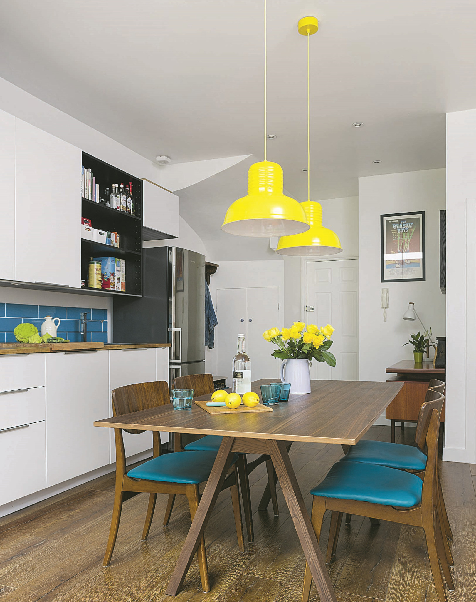 Усилить этот эффект можно с помощью светлой отделки стен и потолка. Если монохромный интерьер кажется слишком смелым, светлой можно сделать лишь часть кухни – например, только верхние или нижние шкафы, или обеденную группу. Интересный вариант – белая кухня с деревянной столешницей. Чтобы белый интерьер не казался монотонным, в палитру стоит добавить несколько темных акцентов – например, коричневый, черный или любой насыщенный, яркий оттенок. Роль таких фокус-точек могут играть светильники, фурнитура, фартук или декор.