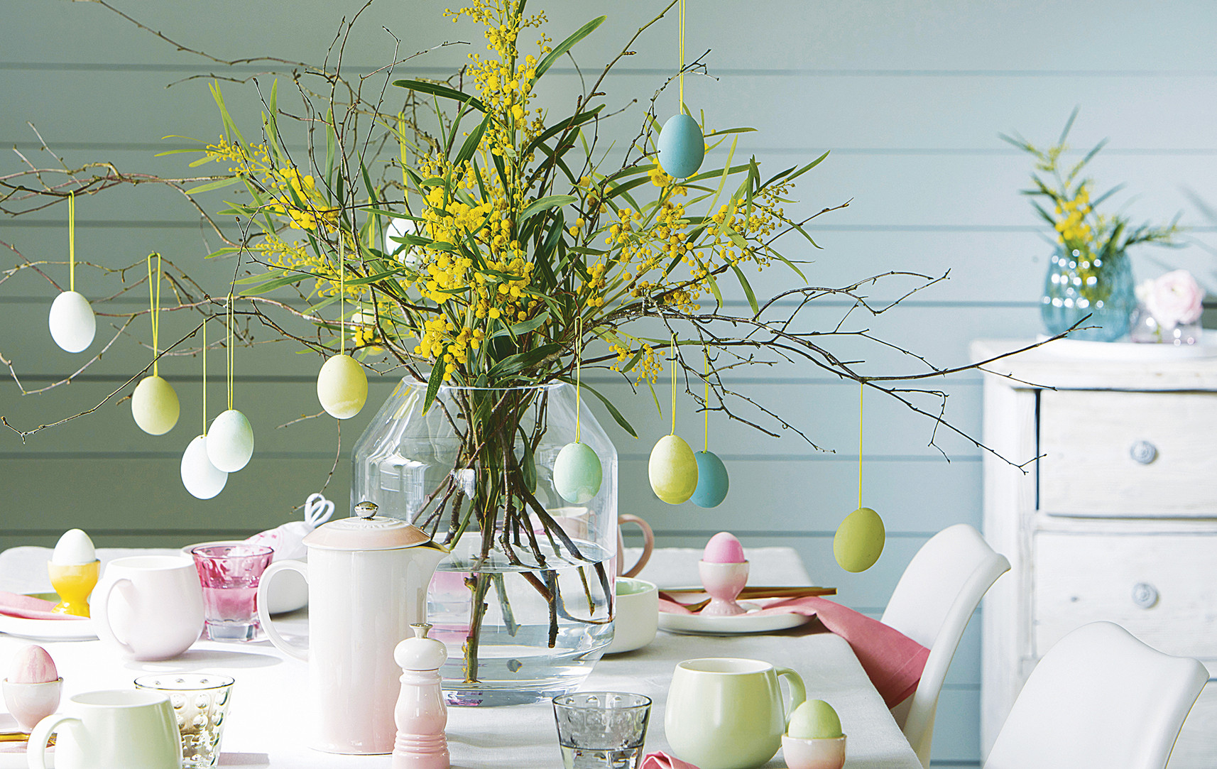 Поставь в вазу веточки вербы с пушистыми почками или любые другие – например, весенние побеги с молодыми листиками или декоративные искусственные ветки. Укрась их подвесками на пасхальную тему. Это могут быть фигурки кроликов, цыплят, декор в форме расписанных яиц, букв «ХВ». Кстати, в процесс украшения можно и нужно вовлечь самых юных членов семьи – именно так формируются семейные пасхальные традиции.