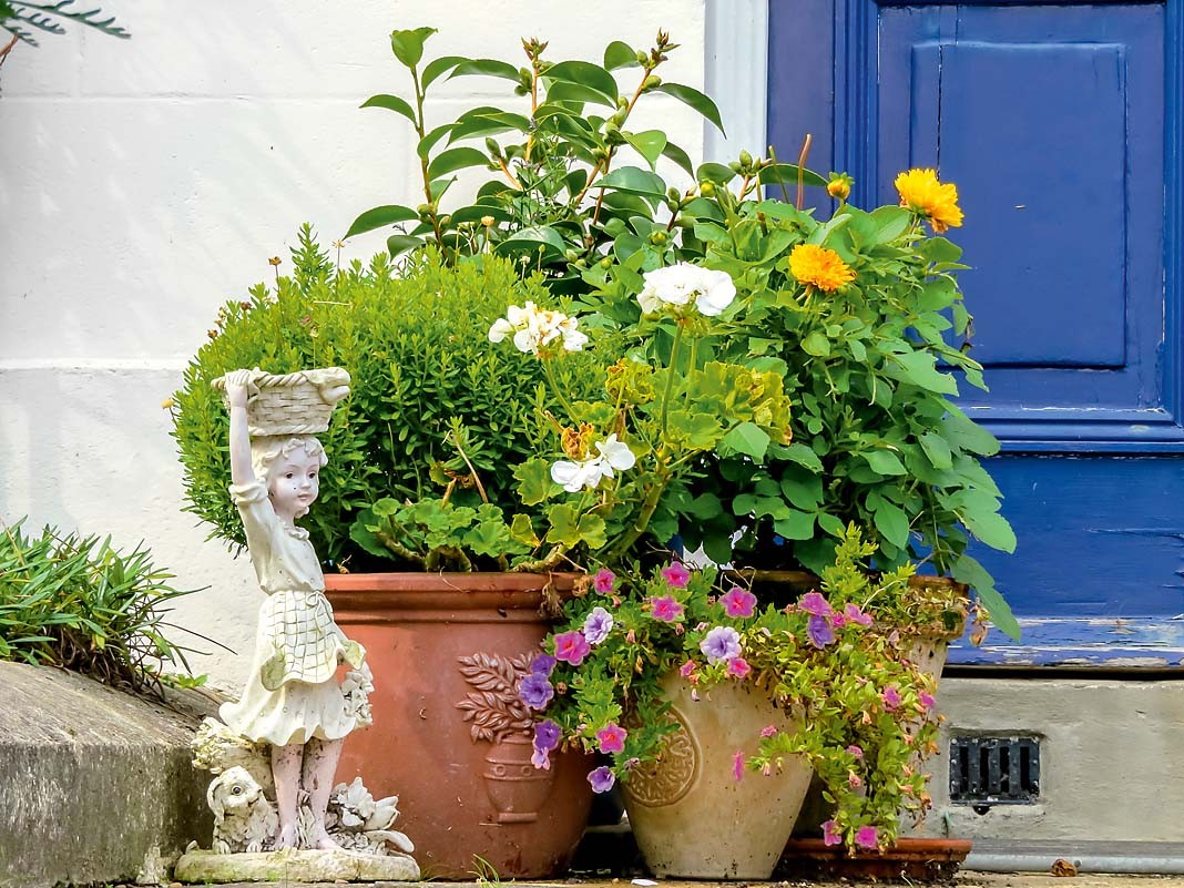 Кадочное озеленение (как на фото). Достаточно купить большой глиняный горшок и посадить туда сурфинию или, например, гортензию крупнолистную (голубую, белую или красную с огромными потрясающими «шапками»).