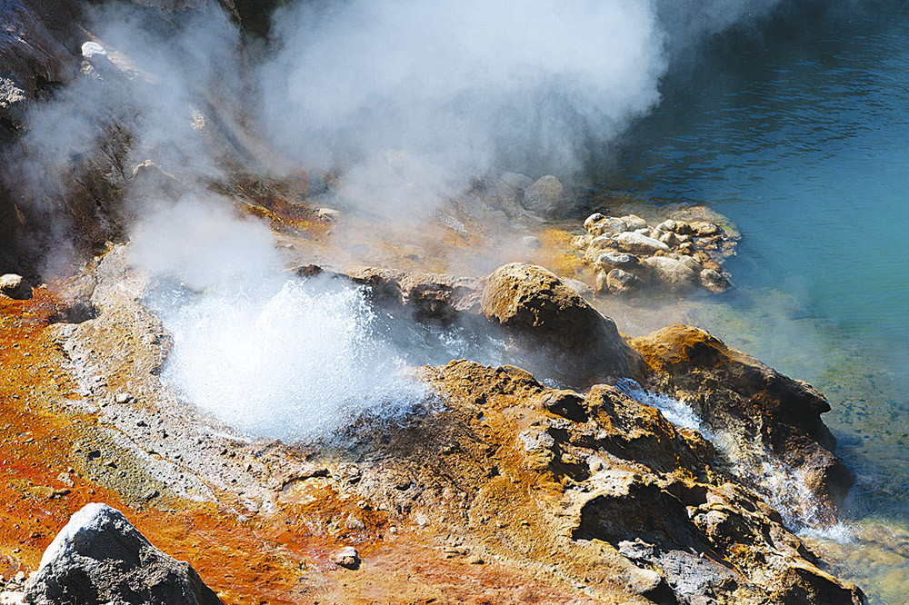 Есть тут и свои знаменитости. Особое впечатление производит витраж гейзеров. На цветастом фоне, образованном горными породами пыхтят и плюются сразу семь гейзеров. Совсем по-другому, можно сказать, зловеще смотрятся грязевые котлы. Они представляют собой земляные ямы, заполненные горячей булькающей грязью. Один из них, самый страшный, так и называется – Врата ада… Есть и гейзеры-котлы, затопленные водой так, что получились… озера. Так и хочется окунуться, но делать этого не стоит. В котле Голубой вода и в самом деле небесно-голубого цвета и нагревается до… 85 градусов!