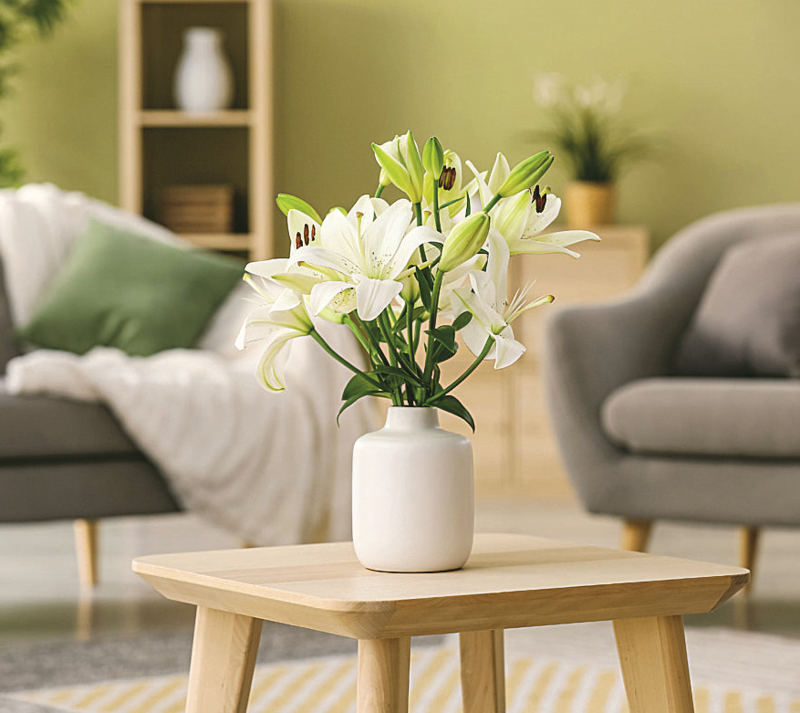 Элегантные цветы-долгожители, однако у них есть весьма ощутимое «но» – специфический аромат, который многих раздражает. Но если тебе нравится их стойкий запах, смело вводи лилии в свой интерьер. На стебле у них растет сразу несколько бутонов, поэтому для красивого букета будет достаточно 3–5 штук. Выбирай цветы, на стеблях которых много нераспустившихся бутонов, – они дольше простоят. Учти, нельзя размещать лилии под прямыми солнечными лучами, а также на листья не должна попадать вода, поэтому опрыскивать лилии не нужно.