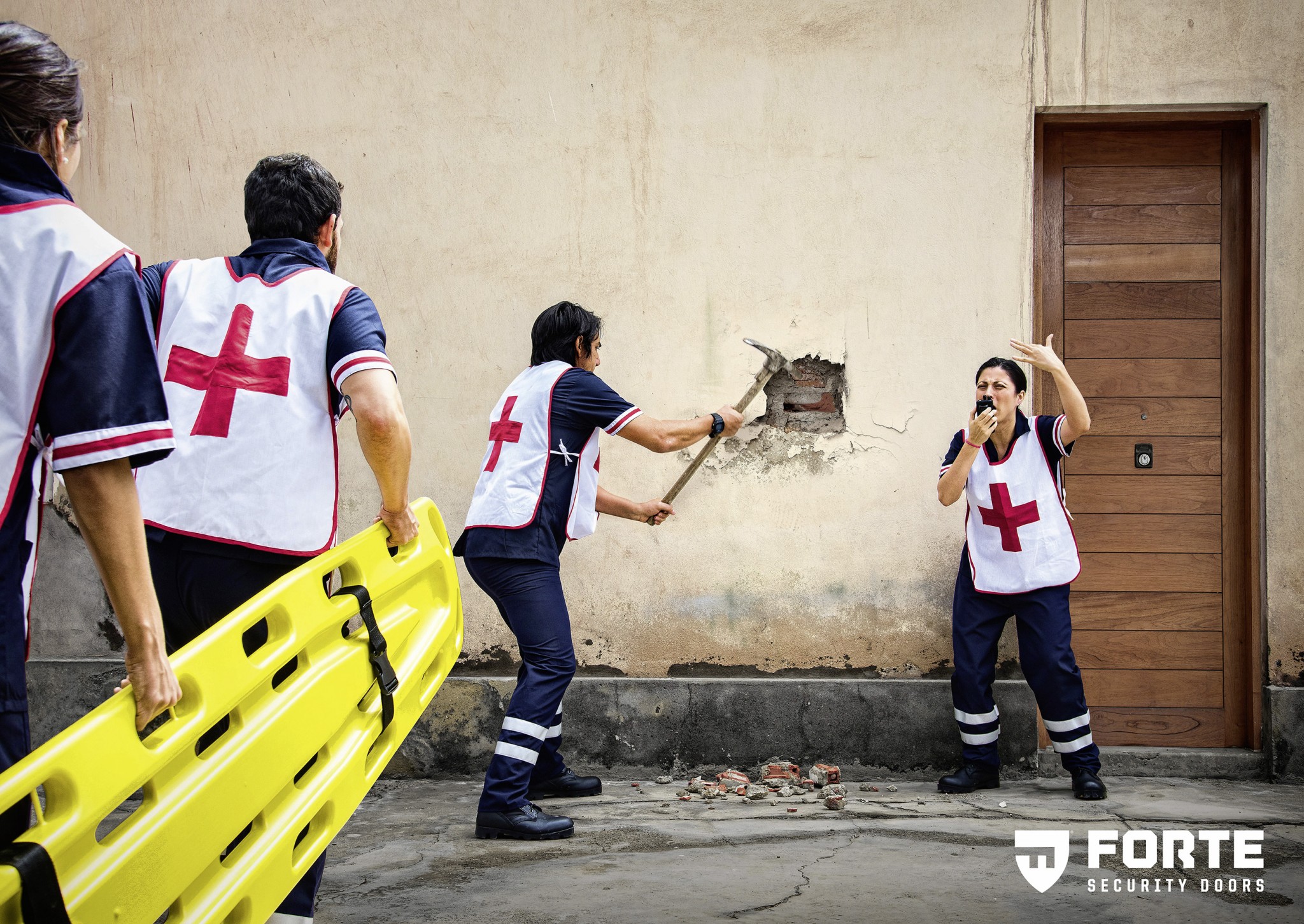 Рядовые перуанцы для захода в дом пользуются дверьми. Это их даже роднит как-то с россиянами, да и вообще с гражданами стран бывшего СССР. Некоторые перуанцы злоупотребляют этой привычкой и заходят через дверь в чужие дома! Именно с этим криминальным явлением и борется производитель укрепленных дверей Forte. В его рекламной серии от агентства Circus Grey медики, пожарные и спецназовцы вламываются в дом, нащупав слабое место – стену. Circus Grey, Перу, 2017.