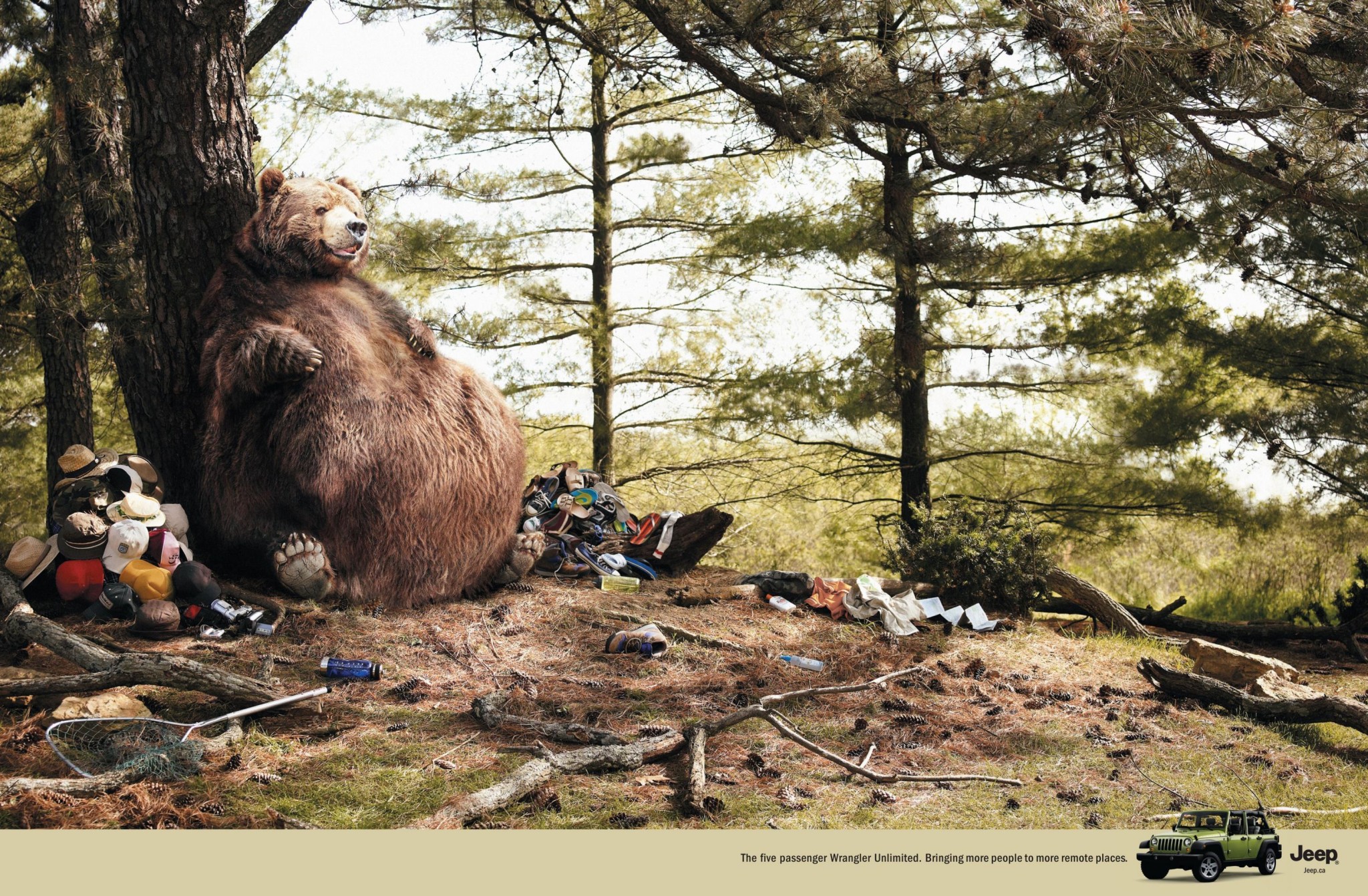 Мораль канадского принта такова: «Пятиместный Jeep Wrangler Unlimited способен унести больше людей в живописные дали». Античеловеческий характер картинки говорит о том, что реклама публиковалась исключительно в медвежьих изданиях, таких как «Косолапый Юкон» и «Виннипегский бурелом». Не планировалось, что ее увидят люди, однако шила в берлоге не утаишь. Реклама вызвала огромный межвидовой дипломатический скандал, борцы за права человека организовали массовые пикеты в медвежьих пущах. После чего канадские мишки стали еще толще.