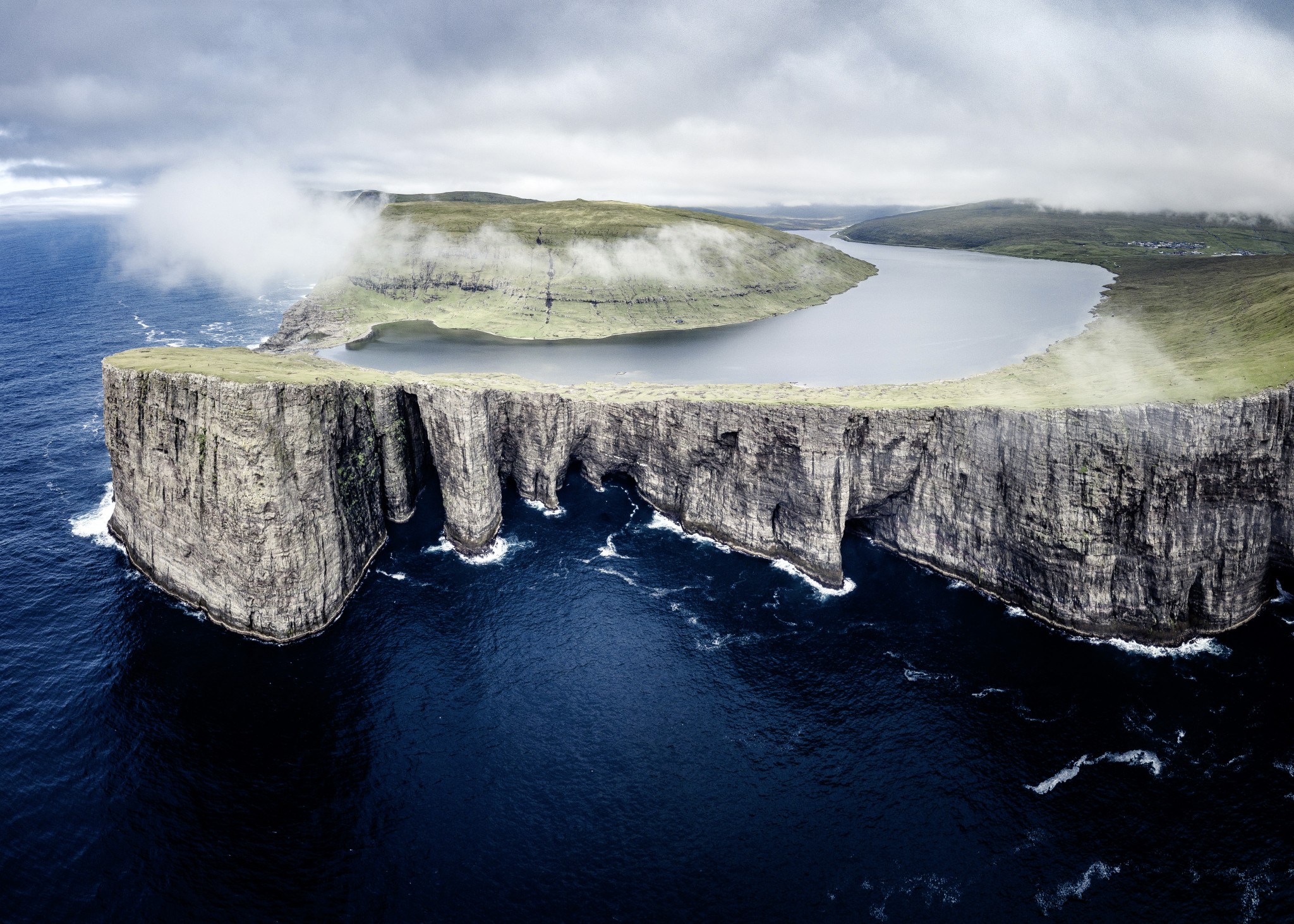 Озеро Сёрвогсватн (также в справочниках обозначается как Лайтисватн) – весьма странное сооружение, как ни погляди. Лучше глядеть сверху. Разлили его на острове Воар, что в Северной Атлантике. Остров-то не бог весть какой, площадь как у города Сочи, но на нем аж два озера поместились. Самый крупный пруд Сёрвогсватн нравится народу особенно, потому что он непостижимым образом висит прямо над океаном и не стекает вниз. На самом-то деле вода потихоньку сливается, просто водопады-интроверты прячутся в рельефе от посторонних