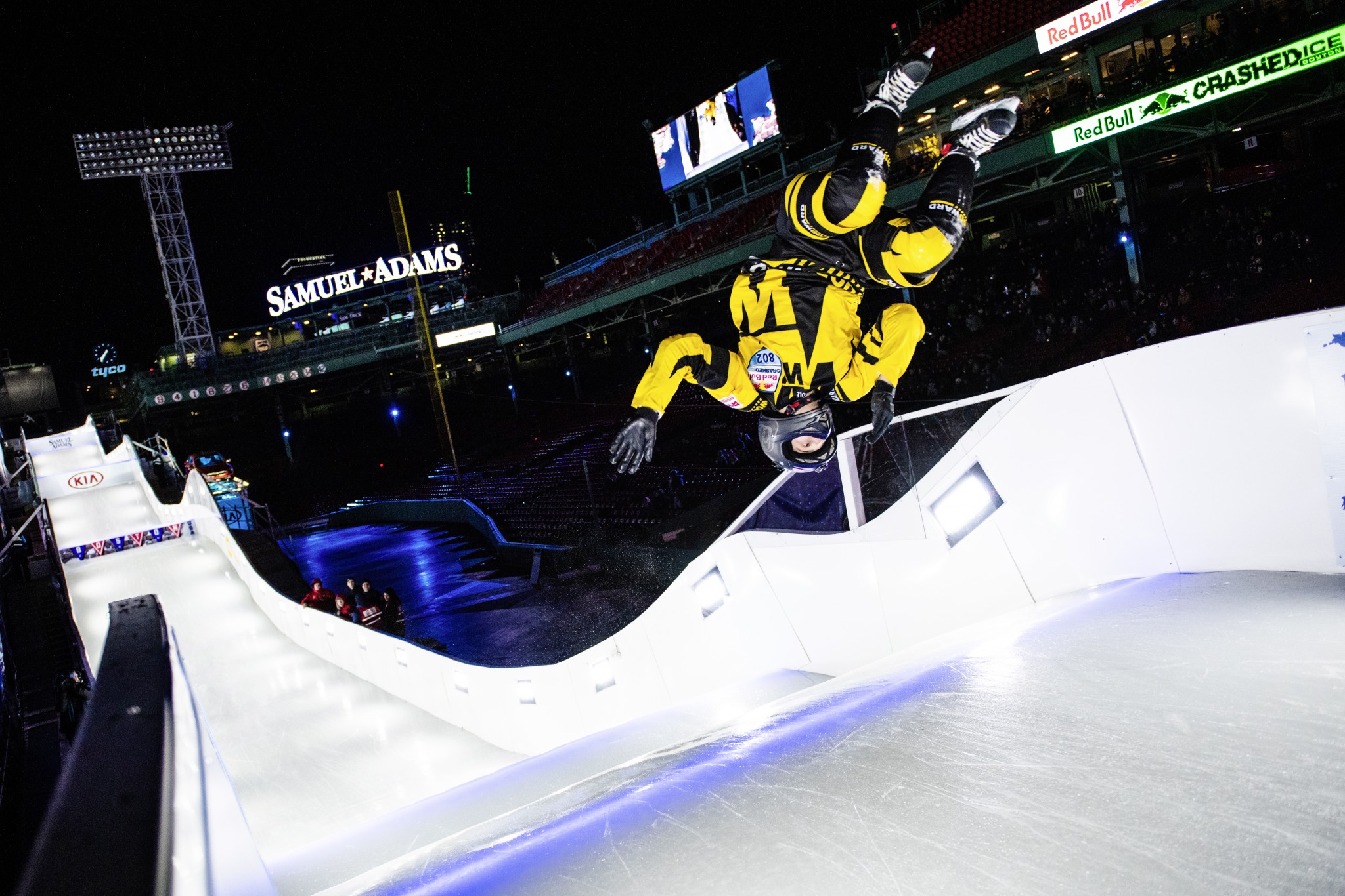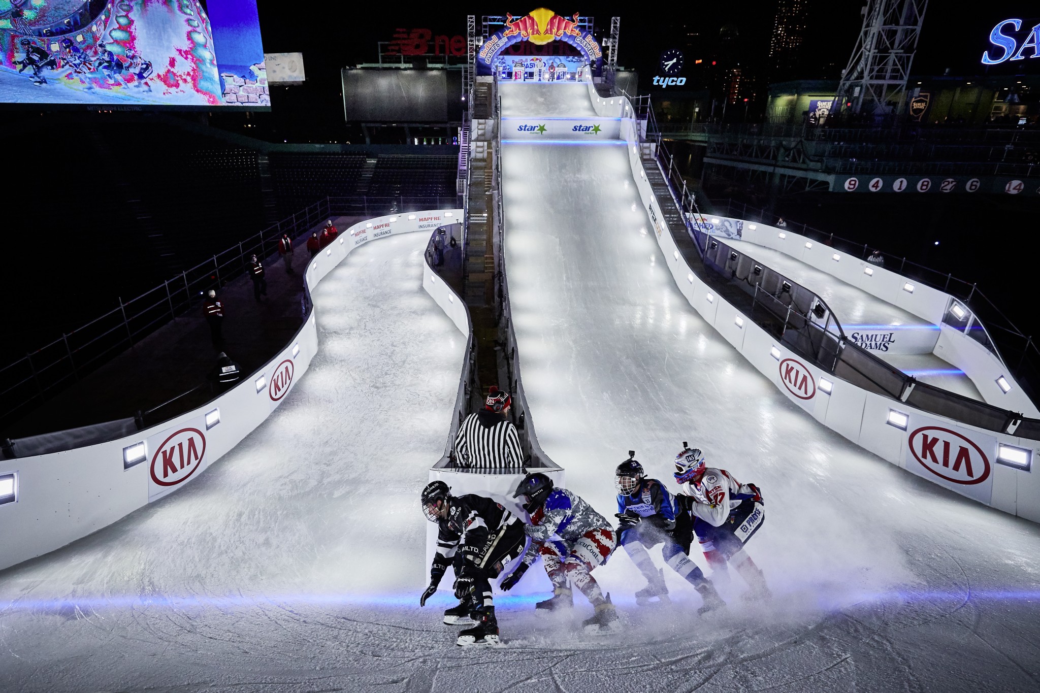 Во время соревнований по скоростному спуску на коньках спортсмены бегут по ледяному желобу, полному трамплинов и препятствий. На коньках и наперегонки. Гонка проходит в несколько заходов, по принципу «царя горы»: из каждого забега, в котором участвуют четыре человека, в следующий тур проходят двое, в итоге на трассе останутся четыре финалиста, которые и поборются за призовые места. В этом году последний этап международных соревнований Red Bull Crashed Ice впервые прошел на стадионе, и не на каком-нибудь, а на знаменитом бостонском Фенуэй-Парк, где с 1912 года проводит свои домашние матчи команда «Бостон Ред Сокс»! В перерывах между забегами на 350-метровой искусственной трассе также можно было наблюдать трюковых велосипедистов, которые, впрочем, смотрелись не совсем в своей тарелке, и спортсменов в плюшевых костюмах зверей, которые тоже бежали наперегонки, спотыкаясь о хвосты и лапы. Ради такого зрелища действительно стоило померзнуть пару вечеров на Фенуэй-Парк!