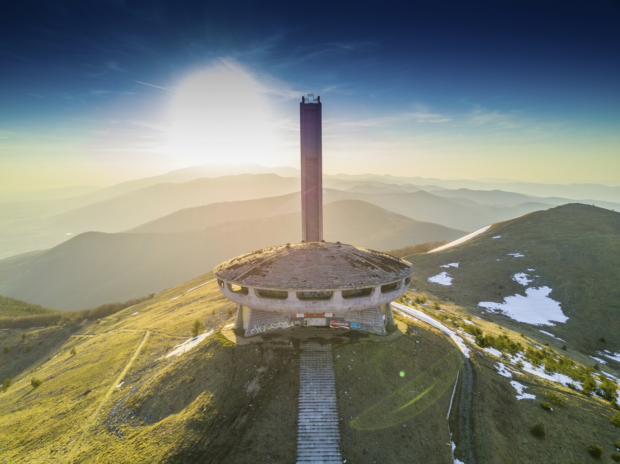 Если бы любителя космических заговоров и телепатических контактов с планетой Нибиру занесло к подножию горы Бузлуджа неподалеку от болгарского города Габрово, он бы, вероятно, тут же выронил третий глаз от удивления. Дело в том, что на вершине этой горы припаркована форменная летающая тарелка, и чем ближе к ней походишь, тем более поразительное открывается зрелище. Начнем с того, что к огромному бетонному блюдцу ведет заросшая травой парадная каменная лестница. Постепенно становятся видны таинственные барельефы на ее корпусе, которые складываются в слова: «Работници, работнички от вси страни сплотете се!» Если любителю паранормального случилось быть неславянского происхождения, для него тоже есть послание, однако написанное уже поверх бетона просто красной краской: «Never forget your past! Communism».