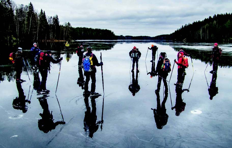 Его тоже придумали наши добрые соседи финны, которые здраво рассудили, что кататься на коньках по кругу – довольно однообразное занятие. Особенно в местности, где половина территории покрыта водой и замерзает на зиму. Поэтому, едва лед достигает толщины 5 см, финны выходят на естественные водоемы и покрывают по 50–60 км в день. Есть даже клуб Suomen Retkiluistelijat (его название одновременно является финским алфавитом и скороговоркой), который организует групповые походы (программу можно найти на www.skrinnari.fi). Но имей в виду, что обычные коньки для такого не подойдут: в них быстро устанешь. Для таких походов на горнолыжные ботинки ставят длинные полозья, а в руки берут лыжные палки. За спиной должен быть рюкзак с едой, горячим чаем в термосе, сменной одеждой и веревкой. Если провалишься под лед, он же станет поплавком.