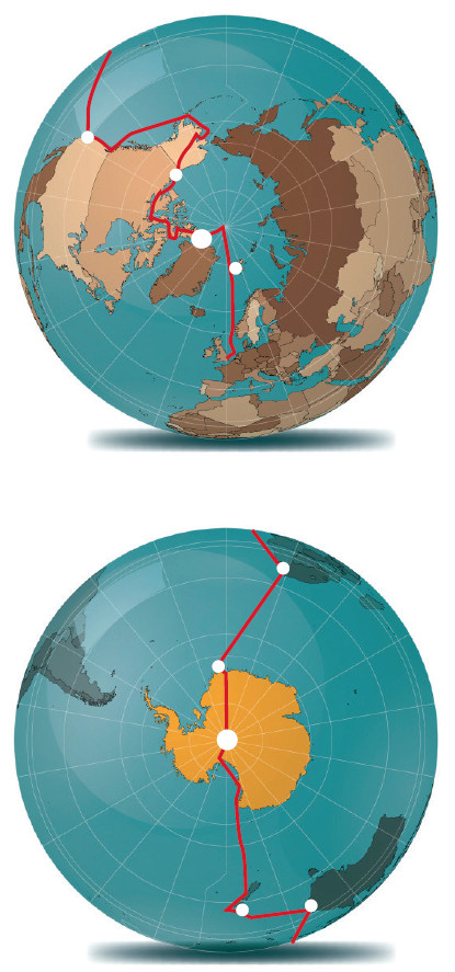 Первый вариант маршрута был нарисован Джинни карандашом на школьном глобусе. Он начинался в Гринвиче, спускался вниз через африканский континент к Южному полюсу, оттуда снова вверх через Скотт-Бейс (новозеландская полярная станция) — Крайстчерч — Сидней — Лос-Анджелес — Ванкувер — Доусон — Алерт по Северо-Западному морскому проходу к Северному полюсу и через Шпицберген снова в Гринвич. А тот самый глобус можно увидеть в Национальном морском музее.
