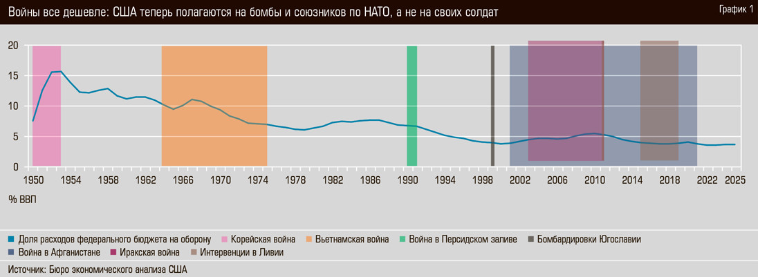 Начнем с классического показателя — доли военных расходов в ВВП. К началу конфликта США подошли с довольно скромным бюджетом в 3,7% ВВП. Для сравнения: Корейскую войну они начали с 7,6%, Вьетнамскую — с 10,2%, Войну в Персидском заливе — с 6,8%, в Афганистане — с 3,9%, Иракскую войну — с 4,5%, Вторую интервенцию в Ливию — с 4% (см. график 1).