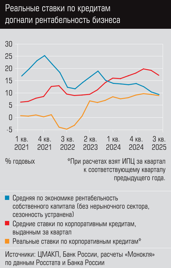 Вывод, что стоимость денег является проблемой для российской промышленности, можно сделать и посмотрев на то, как соотносится средняя по экономике рентабельность собственного капитала (без нерыночного сектора, сезонность устранена), которую рассчитали в ЦМАКП, со ставками по корпоративным кредитам. Если в первом квартале 2024 года ставки по корпоративным кредитам превзошли среднюю рентабельность, то к третьему кварталу 2025-го рентабельность догнали уже реальные ставки по кредитам (для их расчета мы взяли ИПЦ квартал к соответствующему кварталу предыдущего года). Только очень небольшое число компаний обладает рентабельностью, которая может позволить безболезненно брать кредиты по реальным ставкам в районе 10%.